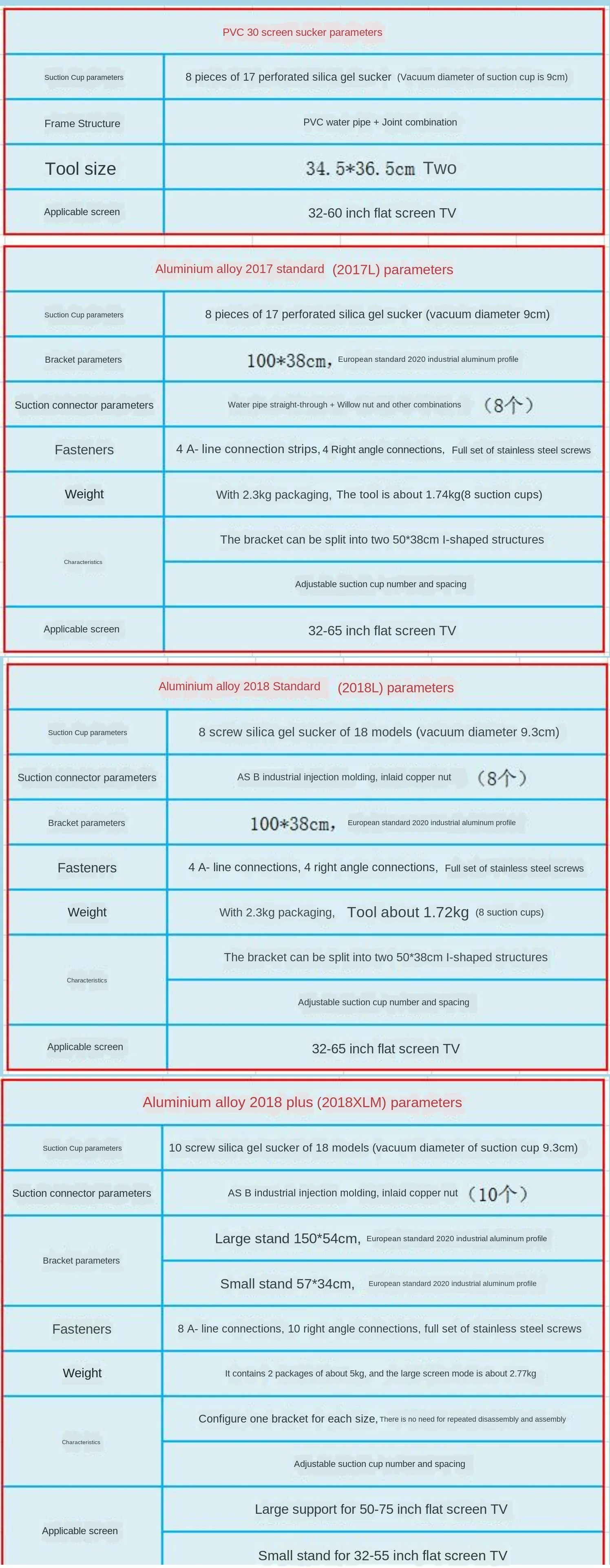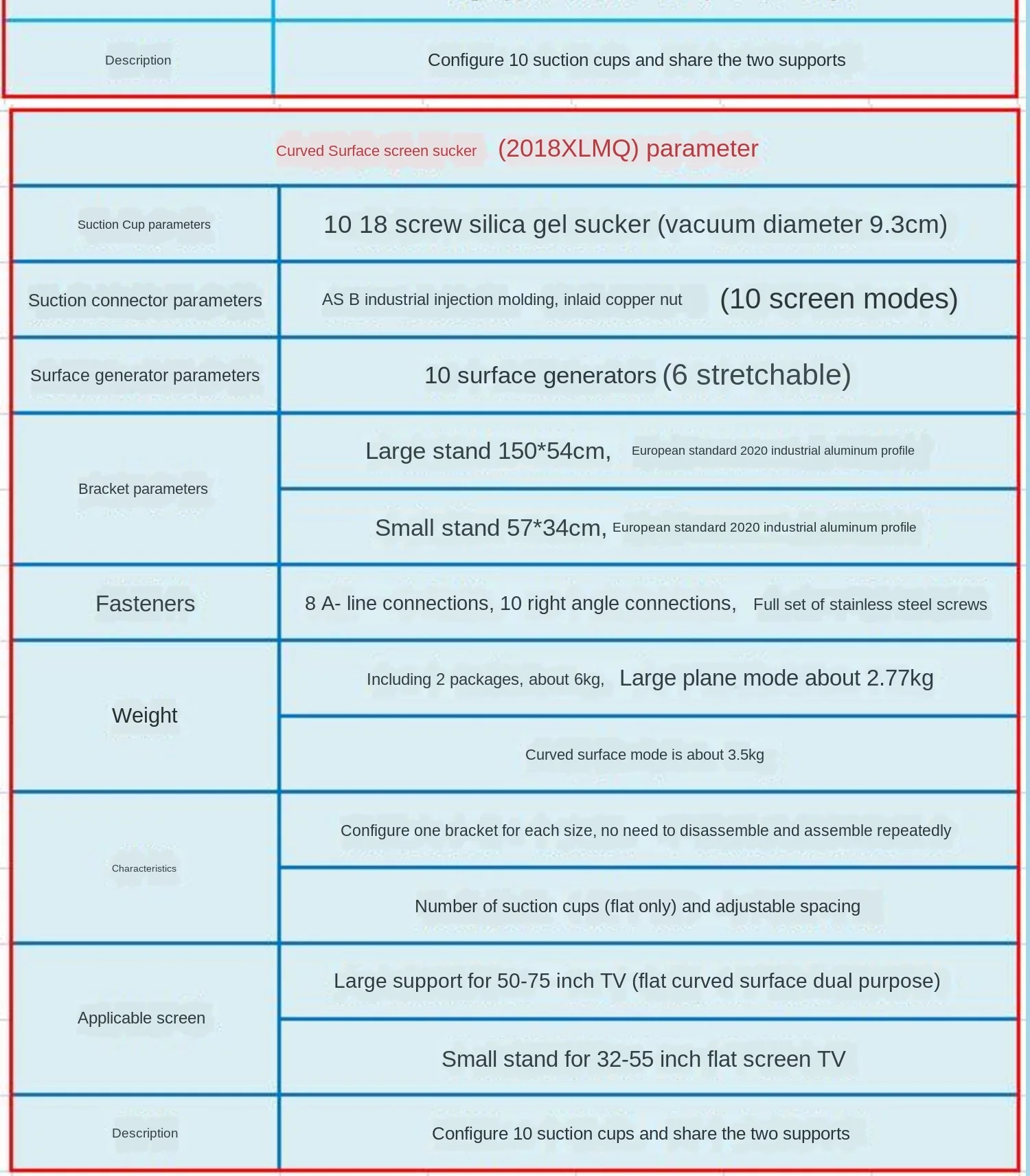 Изогнутая Присоска на экран (2018XLMQ) Параметры: Параметры присоски: 2018 силиконовая присоска винтового типа * 10 шт. (диаметр вакуума: 9,3 см) Параметры соединителя присоски: ASB промышленное литье под давлением, инкрустированная Медная гайка (10 шт) Параметры поверхностного генератора: генератор изогнутой поверхности * 10 шт. (6 шт. масштабируемый) Параметры кронштейна: Большой кронштейн 150*54 см, европейский стандарт 2020 промышленный алюминиевый профиль; Небольшая скобка 57*34 см, европейский стандарт 2020 промышленный алюминиевый профиль Крепеж: шлицевая соединительная планка * 8 шт., Угловой Соединитель * 10 шт., полный набор винтов из нержавеющей стали Вес: 2 упаковки, около 6 кг, большой плоский режим, около 2,77 кг; Изогнутый режим, около 3,5 кг Характеристики: Размер конфигурации 1 кронштейн каждый, не нужно повторно разбирать и комбинировать; Количество присосок (только плоские) и расстояние можно отрегулировать Применимый экран: большая подставка для 50-75 дюймового телевизора (плоская поверхность изогнутая двойного назначения); Маленькая подставка для 32-55 дюймового плоского телевизора Примечание: конфигурация присоска * 10 шт., обмен двумя кронштейнами