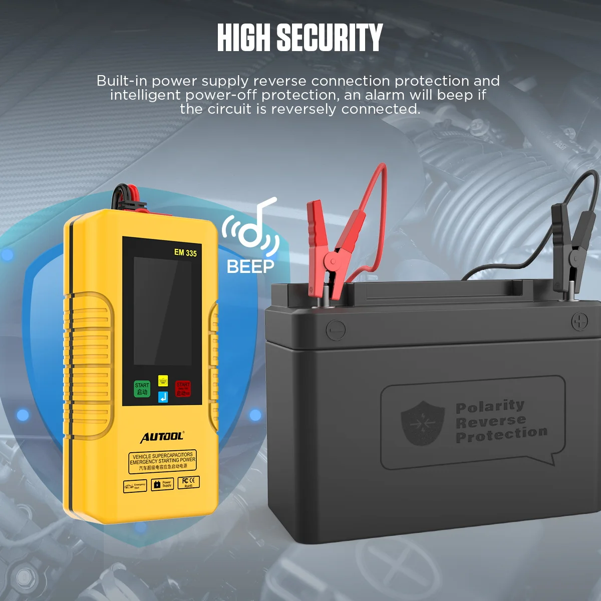 1. Защита от перегрузки и короткого замыкания Для перегрузки и короткого замыкания (запуск процедур не увенчался), устройство генерирует оповещение (острый звуковой сигнал), чтобы предупредить пользователя, символ «двигатель» будет мигать, пожалуйста, проверьте, есть ли какая-либо внутренняя неисправность или двигатель не имеет возможности запуска. После удаления зажимы "крокодил", устройство перестанет звуковой сигнал. 2. Защита от обратной полярности электрона Если обратный электронный полярности подключается прибор генерирует оповещения (быстро звуковой сигнал) для предупреждения пользователя «автомобильного аккумулятора "Символ начнет мигать переменный, пожалуйста, снимите зажимы" крокодил "снимаются и подключите правильно. После того, как зажимы "крокодил", устройство перестанет получения звукового сигнала. 3. Защита от перезарядки Если вход постоянного тока или зажимы "крокодил" получать ненормальным высокого напряжения от внешних источников прибор генерирует оповещения сигнал для предупреждения пользователя «дефективные продукты» Символ начнет мигать, пожалуйста, снимите зажимы "крокодил" или постоянного тока источник и еще раз проверьте, правильно ли для того, чтобы обеспечить входное напряжение является правильным. После того, как зажимы "крокодил" снимаются, устройство перестанет получения звукового сигнала. 4. Защита от перегрева Если устройство используется интенсивно или при экстремально высокой температуре, микропроцессорная управляемая электронная схема будет запрещать функцию аварийного запуска. Пожалуйста, повторите попытку через минуту или используйте устройство в подходящей среде.