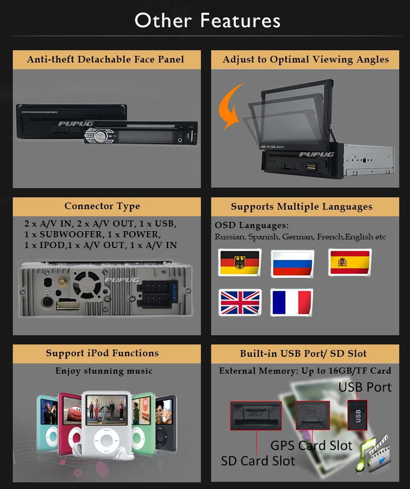 4. Совместимость с аудиовыходом iPod/iPhone, смартфонов и большинства MP3-плееров, воспроизведение DVD/CD/USB/SD, MP3, WMA, FM/AM и смартфонов.