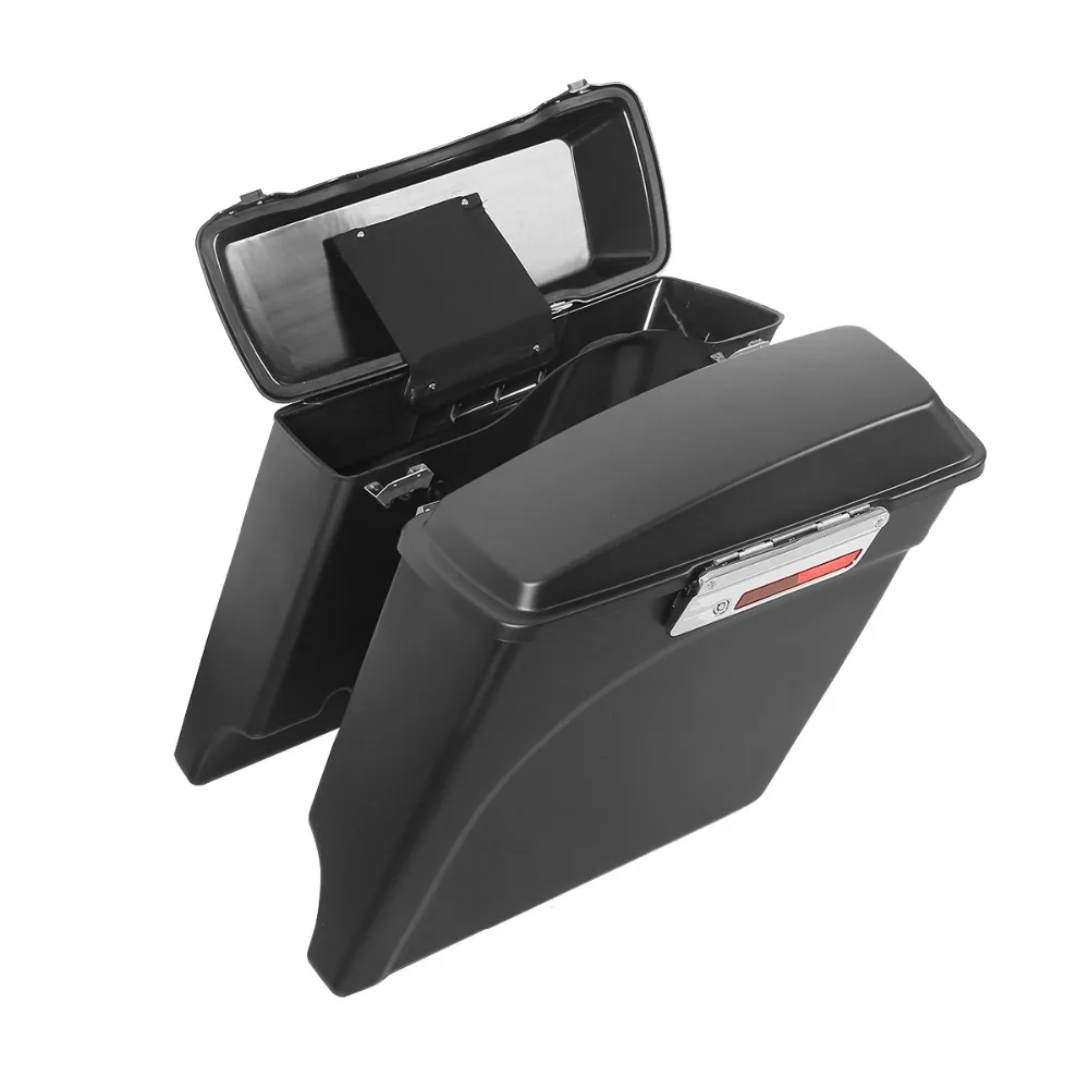 Седельные сумки растягиваются на 5 дюймов дольше, чем на складе, чтобы прикрыть глушитель спереди и придать этому растягивающемуся виду