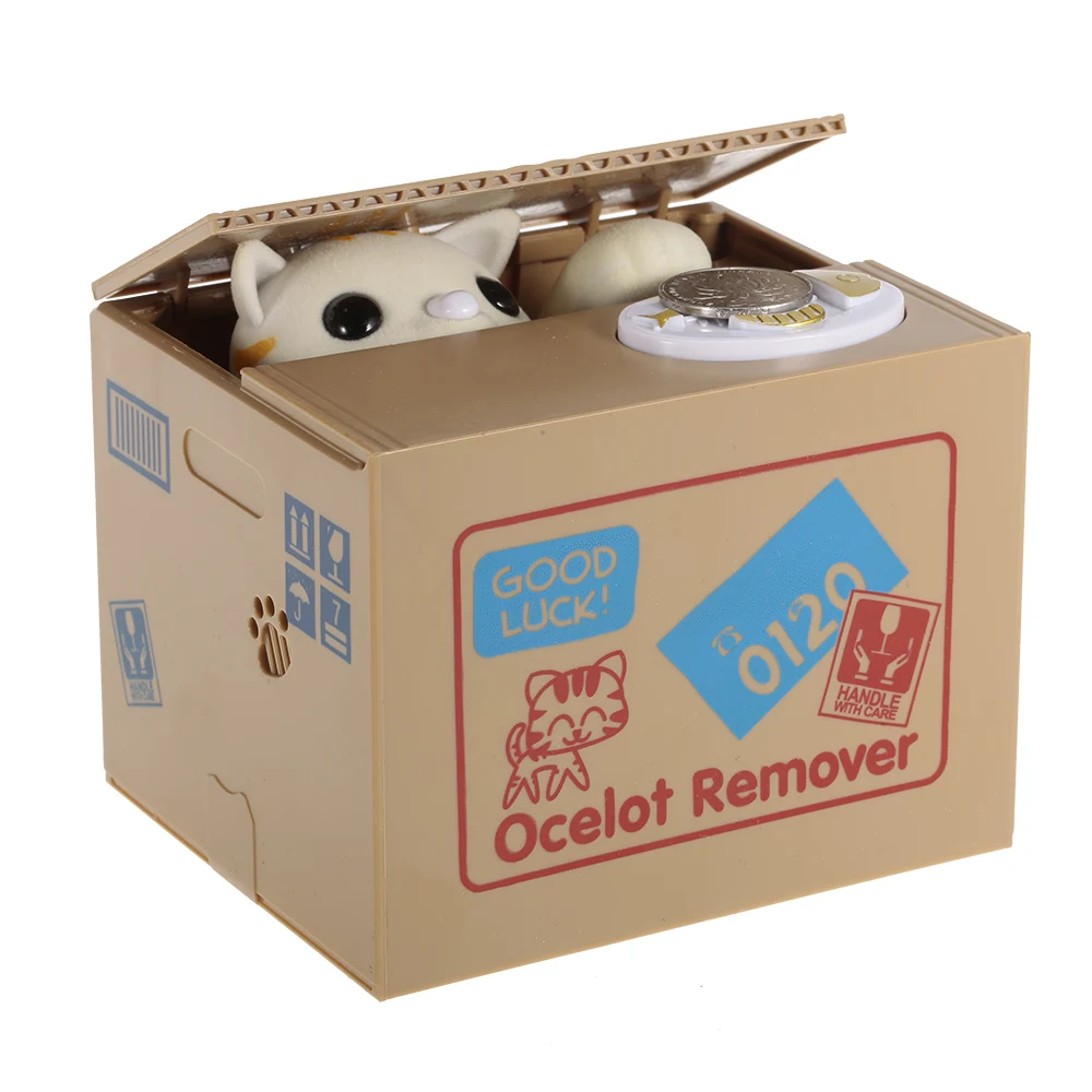 Это автоматически Монетный банк с милым животным дизайном, который выйдет из картонной коробки и захватит ваши монеты из тарелки. Нужно только положить монеты на место для монет, кошка или панда помогут вам взять их, а затем помогут вам сохранить их. Несколько слов, это идеальный подарок для ваших детей и может научить важность экономии денег.