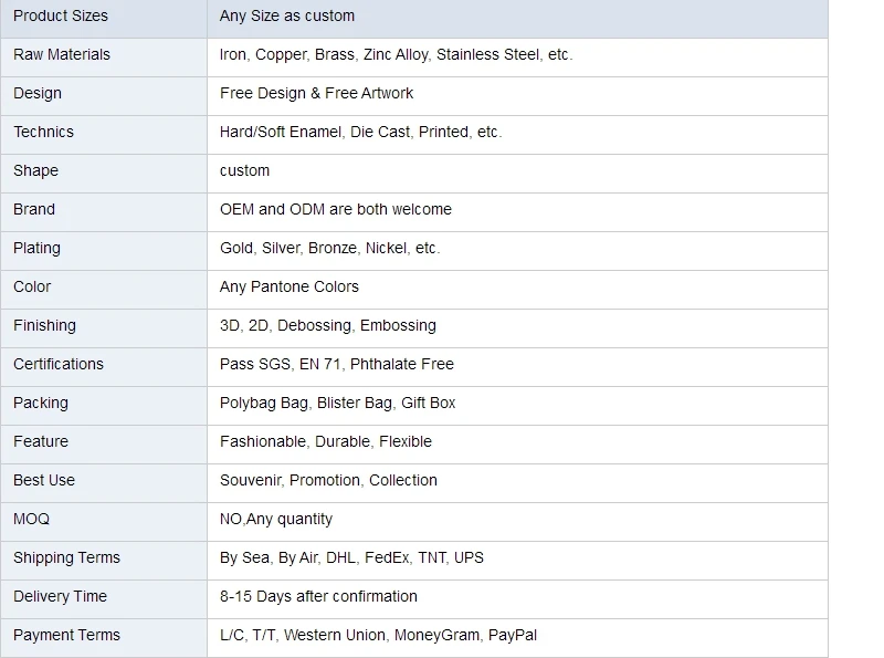 Мы являемся известным производителем, расположенным в Шэньчжэне, Китай. Мы главным образом обеспечиваем изготовленный на заказ металлический значок & штыри & брошь отворота, конис, ключ, цепи, медали & ленты, стикер логотипа автомобиля & эмблема автомобиля, запонки & зажим для галстука, пряжка ремня, зажим для денег, закладка и вышитая нашивка и тканая этикетка. С 1200 квалифицированными рабочими на нашей фабрике, мы можем обеспечить быструю доставку и хорошую цену. Наш минимальный заказ начинается только с 50 шт. У нас есть хорошо образованные продавцы, чтобы общаться с вами и обрабатывать весь процесс от художественного произведения до окончательной доставки. Пожалуйста, свяжитесь с нами в любое время. Индивидуальный дизайн Примечание: 1 заказ в нашем магазине или отправить нам письмо. 2. Сообщите нам ваш ум и отправьте дизайн логотипа. 3 нарисуйте иллюстрацию и подтвердите ее 4 все в порядке. Сделайте платеж и начните разработку вашего дизайна.