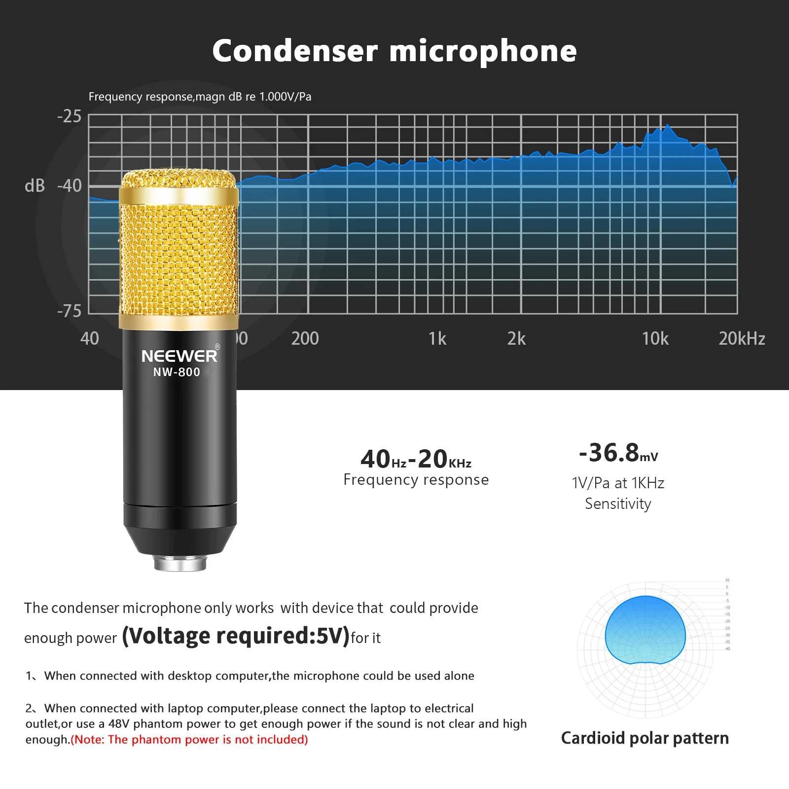 1. Конденсаторный микрофон работает только с устройством, которое может обеспечить достаточную мощность(Требуемое напряжение: 5 В)Для этого.