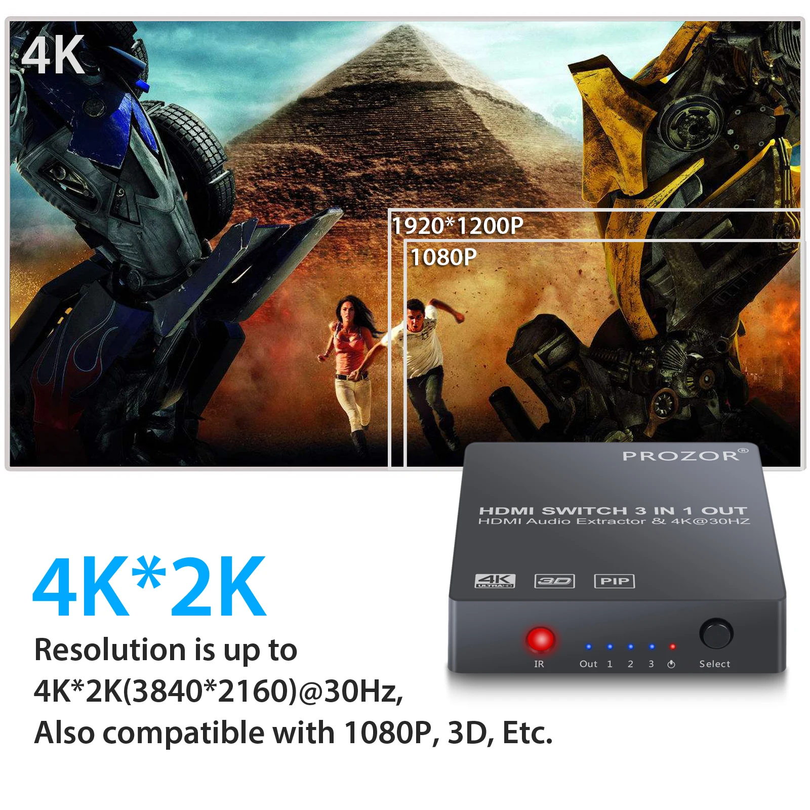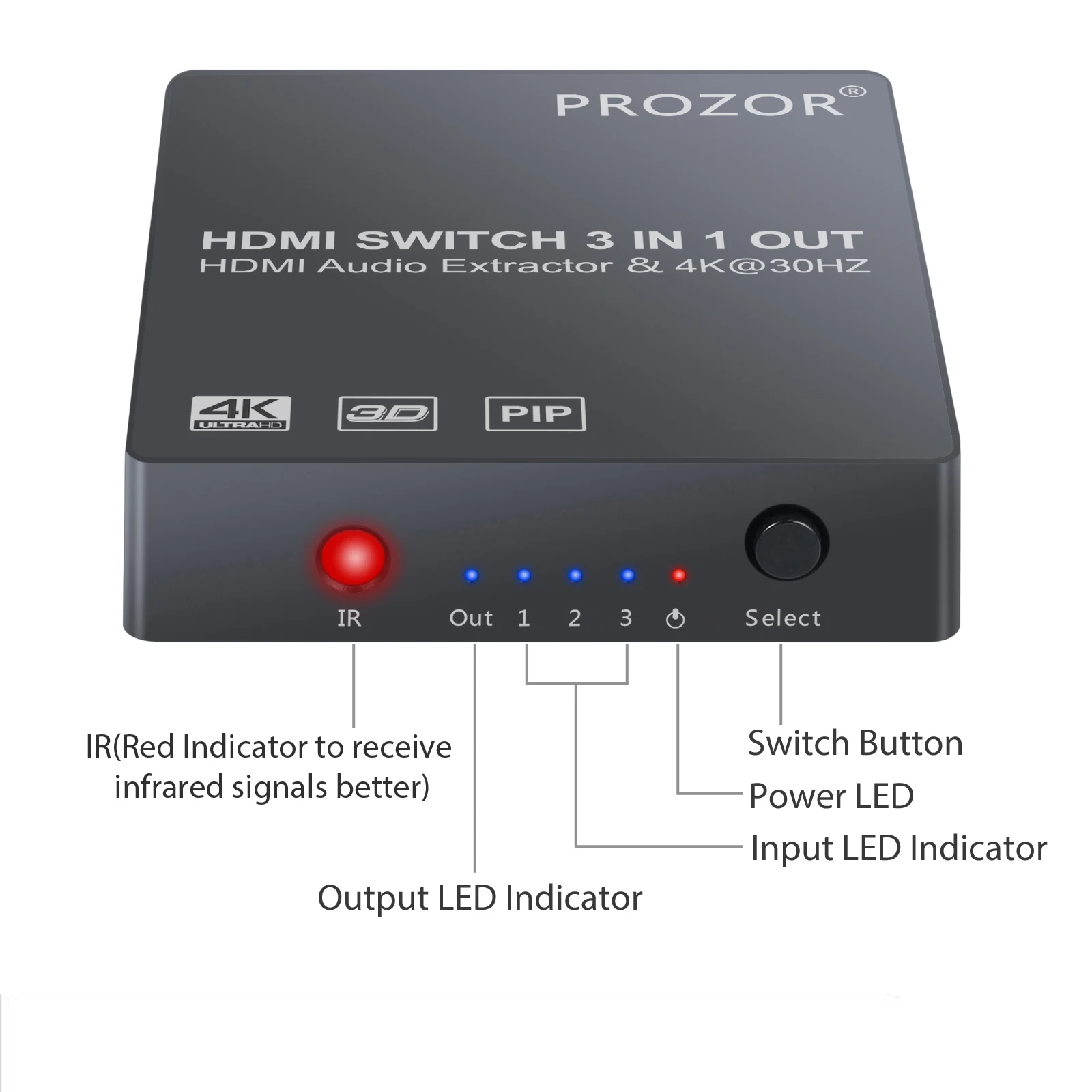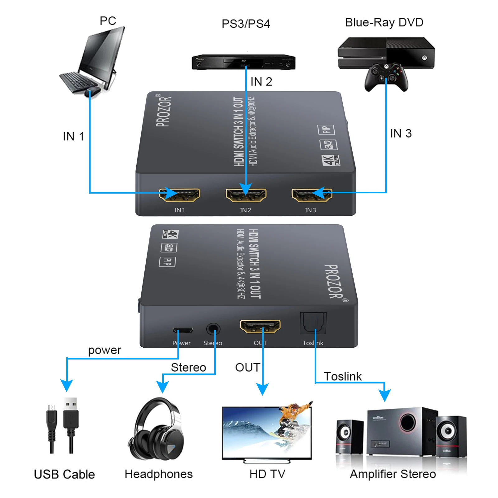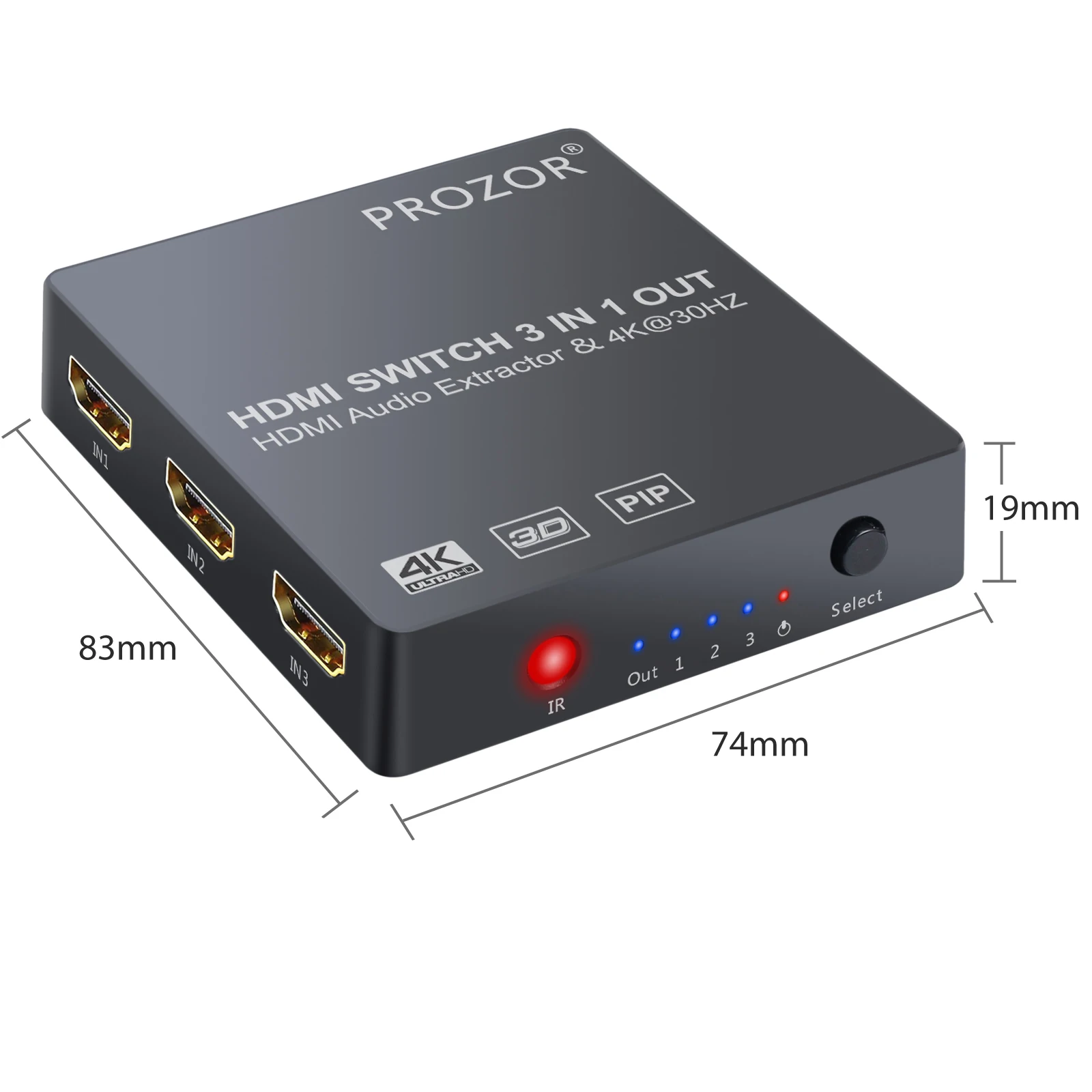 3x1 HDMI коммутатор с аудио экстрактором конвертер аналоговый оптический Toslink SPDIF выход Поддержка 4K 3D 1080P PIP Обзор: материнская плата Hdmi-переключатели широко используются для домашних развлечений, конференц-залов, школ и различных тренировочных мест. Этот аудиоэкстрактор HDMI имеет 3 входа HDMI, один выход HDMI, один оптический выход Toslink и стерео выход с кабелем RCA, избегайте частого подключения/отключения HDMI кабелей. Особенности: 1,3 порт HDMI коммутатор: Поддержка глубокого цвета 30 Бит, 36 бит, 48 бит на пиксель. 3,5 мм аудио выход поддерживает только 2CH PCM стерео аудио. Выход Toslink поддерживает 2CH PCM, 5.1CH Dolby Digital, DTS Audio 2. Этот hdmi-переключатель входное разрешение: до 4K @ 30 Гц, 1080P,3D, поддерживает видео EDID пройти, аудио EDID настройки: 2CH и 5.1CH, наш hdmi-коммутатор не поддерживает HDCP 2,2 3. Изображение в картинке: Функция PIP поддерживает до 2 подэкранов и 1 Основной экран дисплеев, что позволяет вам выполнять несколько задач и переключаться между основными дисплеями одним нажатием на инфракрасном пульте дистанционного управления 4. Три HDMI входного преобразователя в один HDMI дисплей (режим пропуска) + оптический Toslink выход (5.1CH режим) или стерео аудио выход (2CH режим) поставляются с rca-кабелем; Автоматическое, ручное или дистанционное переключение 5. Широко совместим: HDMI аудио конвертер подходит для различных устройств источника HDMI, таких как Roku или Chromecast без выделенного аудиовыхода, а также Blu-ray/ DVD/ HD плеер, кабель/спутниковая коробка, Amazon Fire TV,PS3/4, Apple TV, Xbox, ПК/ноутбук, HD камера, HD DVR и т. Д. Технические характеристики: HDCP версии: HDCP1.4 HDMI версии: HDMI1.4b Разрешение HDMI: 2160p @ 30 Гц/1080p @ 50/60 Гц/1080i/720p/1576i/480p/480i Поддержка цветового формата видео: 24 бит/глубокий цвет 30 бит, 36 бит Аудиовыход: 3,5 мм наушники + SPDIF Максимальная полоса пропускания: 340 МГц Максимальная скорость передачи данных: 10,2 Гбит/с Вход/Выход TMDS сигнал: 0,5-1,5 Вольт p-p(TTL) Вход/выход DDC сигнал: 5 вольт p-p(TTL) Расстояние входного кабеля: <= 7 м AWG26 стандартный кабель HDMI Расстояние выходного кабеля: <= 8 м AWG26 стандартный кабель HDMI Максимальный рабочий ток: 500 мА Диапазон рабочих температур: (от-15 до + 55 °C) Диапазон рабочей влажности: от 5 до 90% относительной влажности (без конденсации) Размеры (ДхШхВ): 82x73x19 (мм) Вес: 70 г Примечание: 1. Если ваше исходное устройство 4K @ 60 Гц (HDMI 2,0 и HDCP2.2), установите разрешение 4K @ 30 Гц или 1080p @ 60 Гц для использования этого 3 порта HDMI-переключателя. Как установить разрешение для нашего HDMI переключателя: A). Подключите устройство ввода HDMI 2,0 «4k @ 60hz» непосредственно к телевизору B). Затем перейдите в раздел «Настройка-картинка-Разрешение (выберите «Авто»)-затем перейдите в раздел «HDMI Color FOMA» (выберите «Авто») 2. Не совместим с веб-сайтами Netflix и YouTube. 3. При выборе режима 5,1 каналов выход spdif выводит 5,1 канальный звук в зависимости от того, содержит ли источник входного сигнала 5,1 канальный звук: A). Если он содержит, интерфейс SPDIF OUT будет выводить 5,1 канальный звуковой сигнал, в то время как стерео выход интерфейса нет ничего. B). Если это не содержит, SPDIF и аудио-интерфейс все выход 2 канальный аудио сигнала. 4. Коммутатор PROZOR может использоваться только для устройств HD diaplay с интерфейсом HDMI. Не используйте его с HDM-DVI конвертерами или дисплейными устройствами с интерфейсом DVI. Содержимое упаковки 1 х HDMI аудио экстрактор 1 х ИК-пульт дистанционного управления (без аккумулятора) 1 кабель Micro USB 1x3,5 мм на 2 RCA кабеля 1x1 м HDMI кабель Руководство польз