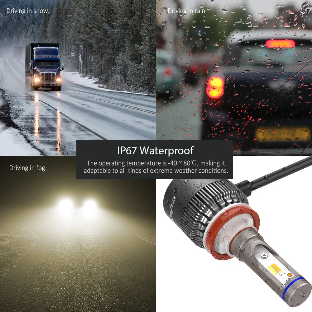 С водонепроницаемостью IP67 и рабочей температурой-40 ℃ ~ 80 ℃, они могут выдерживать все виды экстремальных погодных условий. Дорога впереди может быть освещена, будь то дождливый, снежный или туманный день, давая вам душевное спокойствие.