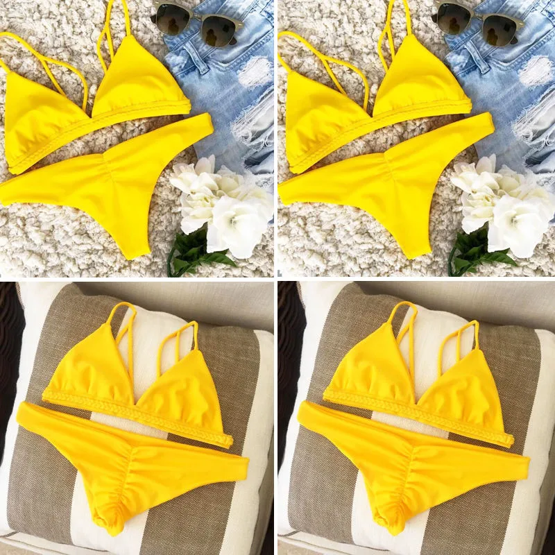 Новинка 2018, сексуальный женский купальник с мягкими чашечками, однотонный желтый/винно-красный комплект бикини с пуш-ап и низкой талией, купальный костюм, пляжная одежда!