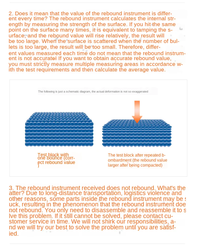 HT-225/HT-225B бетонный молоток Отскок молотка соответствует стандарту GB/T9138-1988 и JJG817-93 процедуры и JGJ/T23-2001 Технические правила. HT-225 бетонный отскок молота подходит для тестирования общих строительных компонентов, Прочность мостов и различных бетонных элементов (доски, балки, колонны, мосты). Описание товара JZC-H бетонный Отскок Молоток является инструментом для неразрушающего контроля структуры и прочности бетона на сжатие. Прочность бетонных элементов Оценивается путем обнаружения твердости поверхности бетонных элементов. Инструмент использует фиксированную весну для привода молотка, и один конец ударного элемента контактирует с другим концом ударного стержня испытательной поверхности бетонного элемента, который будет проверен, тем самым генерируя устойчивость. Под воздействием устойчивости молоток толкает ползунки указателя для перемещения, чтобы получить показания указателя. Инструмент является разумным по конструкции, легко калибровать, ремонт, Малый по размеру и легкий по весу, но он подходит для полевых испытаний. Технические параметры: Номинальная кинетическая энергия: 2.207J Жесткость пружинной пружины: 785N/m Ударная длина молотка: 75 мм Натяжная пружина Рабочая длина: 61,5 мм Расположение молотка: масштаб "100" Твердость молотка и ударного стержня: HRC59 ~ 63 Радиус конца ударного стержня: SR25 мм Трение слайдера указателя: 0.5N ~ 0.8N Среднее значение отскока стальной наковальни 80 ± 2 Размеры: Φ55мм × 280 мм Вес нетто: ≥1 кг Характеристики 1) Центр направляющей стержень принимает импортные материалы с высокой точностью и износостойкостью; 2) в корпусе используется новый пластифицированный материал, высокая точность, легкий вес, хорошее ощущение рук и длительный срок службы! 3) слайдер указателя принимает внешнюю структуру катушки, которая удобна для регулировки трения и может гарантировать Равномерность трения между валом указателя и ползуном указателя обеспечивает точность инструмента. Относительно высокая точность, высокое качество и низкая цена, длительный срок службы. Технические параметры Диапазон прочности: 10-60 МПа Номинальная ударная кинетическая энергия: 2.207J (0.225Kgf. m) Ход молотка: 75 мм Статическое трение слайдера указателя: 0.5N ± 0.8N Радиус кривизны шара ударной поверхности SR: 25 мм ± 1 мм Отскок молотка определяет среднее значение отскока Rm на стальной наковальне: 80 ± 2 Размеры: Φ54*278 мм