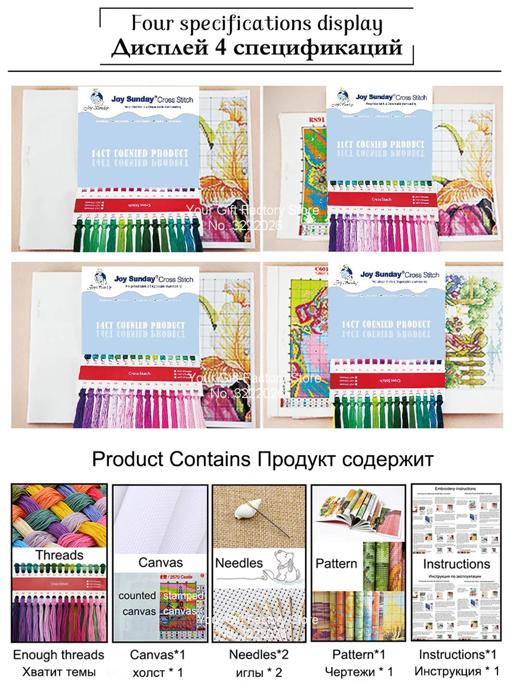 • Штампованная ткань (11CT и 14CT) и Счетный холст (14CT).