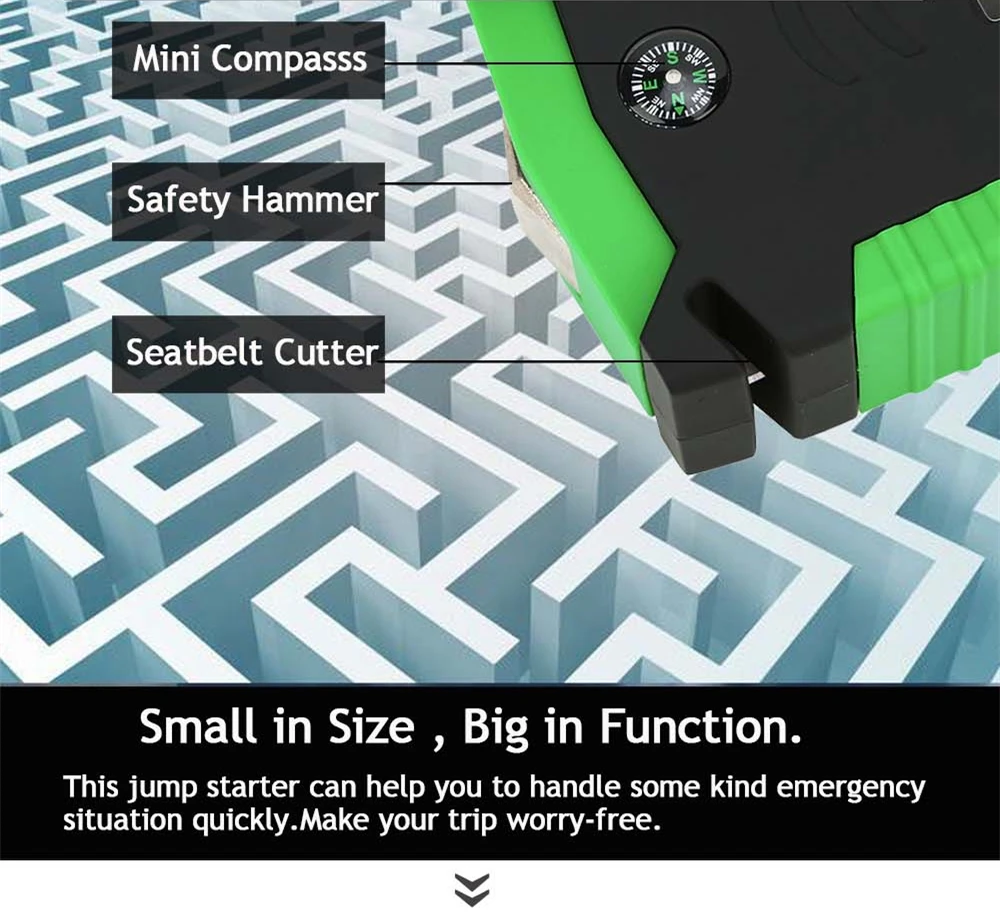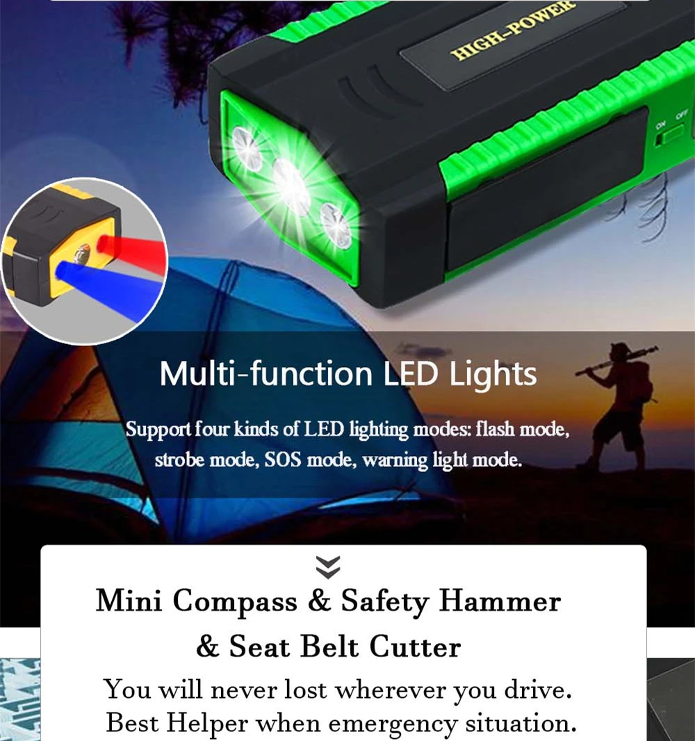 1. Начните автомобиля 12V в чрезвычайных ситуациях 2. Зарядка всех мобильных телефонов в аварийной ситуации 3. Зарядка всех ноутбуков в аварийной ситуации 4. Высокая яркость, многофункциональный светодиодный фонарик 5. Достаточная емкость, маленький размер, тонкий внешний вид