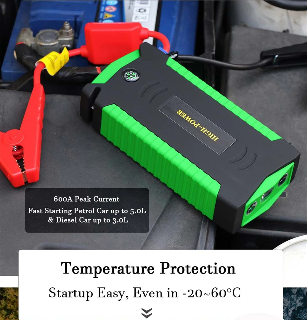 Номер модели: GG-JS-19 Размер: L180 * W85 * H40 мм Вес мощности: 480 г Режим зарядки: CC/CA 12V/15V 1A Выход: 5V-1A/2A/3A/4A, 15V-2A, 16V-3.5A, 19V-3.5A Напряжение автомобильной загрузки: 12 В Ток загрузки: 300A Пиковый ток: 600A Цикл загрузки: запуск автомобиля более 3000 раз Время полной зарядки: 5-6 часов Рабочее состояние: -20 ~ 60 градусов Цельсия Гарантия: 1 год