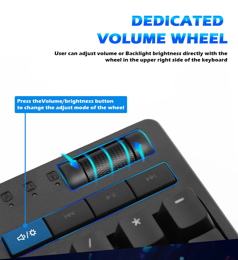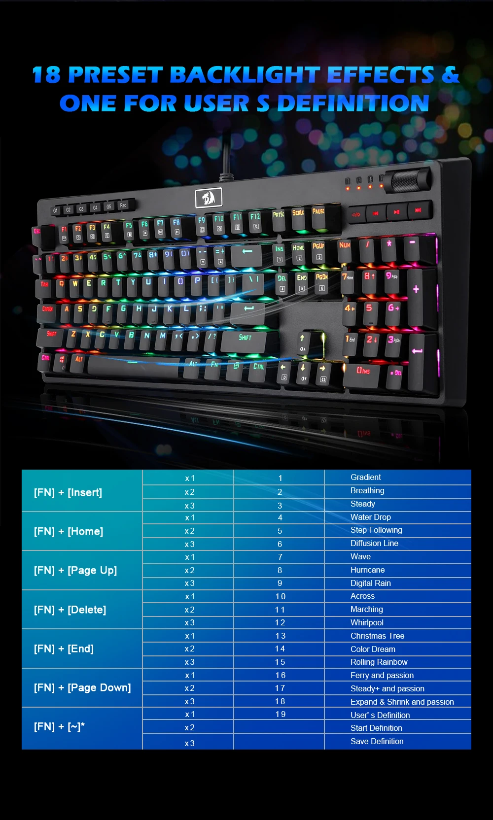 Механическая игровая клавиатура с подсветкой RGB; клавиатура с подсветкой RGB имеет 18 различных режимов освещения RGB, 9 различных цветов, 5 уровней яркости подсветки, скорость дыхания.