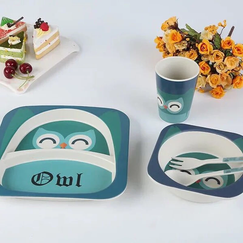 Бесплатная доставка 5 шт./компл. Экологичная детская столовая утварь для кормления Набор с чашей тарелка вилка ложка чашка бамбуковое волокно детская посуда