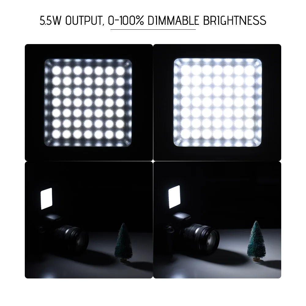Мини светодиодный светильник Andoer W49 выдает макс.. 5,5 W мягкий белый светильник для профессиональной фотографии, например, для свадьбы, портретного изображения продукта и т. д. В светильник имеет 3 типа «Горячий башмак база для того, чтобы вы кирпечей из глины несколько светильник вместе, для лучшего светильник влияние. 0 - 100% Яркость затемнения.