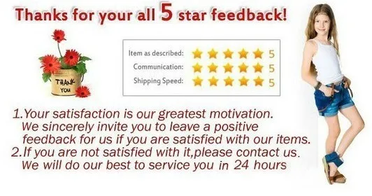 Если у вас есть какие-либо вопросы, пожалуйста, не стесняйтесь связаться со мной в любое время, мы будем восстановлены в течение 24 часов. Если вы не удовлетворены товаром или обслуживанием, пожалуйста, свяжитесь со мной и не оставляйте нам негативные отзывы или отзывы, мы должны предоставить вам удовлетворительное решение. Надеюсь, вы хорошо проводите время здесь!