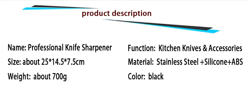 Размер: около 25*14,5*7,5 см Вес: около 700 г Цвет: черный Материал: нержавеющая сталь + силикон + АБС Функция: кухонные ножи и аксессуары Особенности: 1. три различных камня могут удовлетворить большинство ваших потребностей (грубая шлифовка, тонкое шлифование и точность шлифования.). 2. можно регулировать под разными углами (20-60 градусов) 3. резиновая присоска обеспечивает твердость. Комплектация: 3 * алмазные точильные камни + 1 * Заточная полка