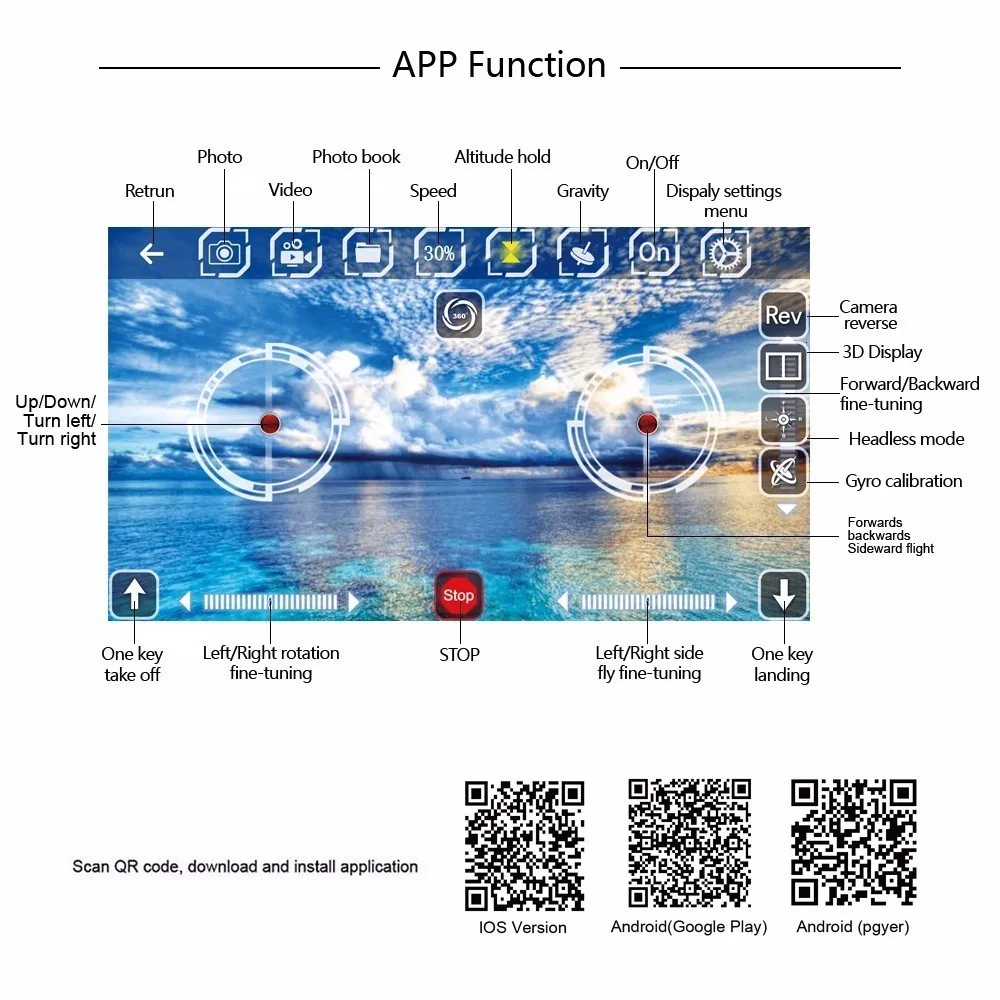 Функция: подъем, падение, наведение, вперед, назад, поворот налево, поворот направо, функция крена с четырех сторон, режим Безголового движения, режим удержания высоты, взлет с одной клавишей, посадка с одной клавишей