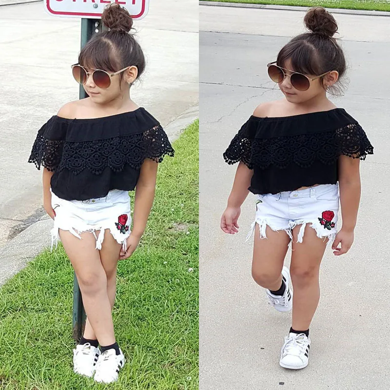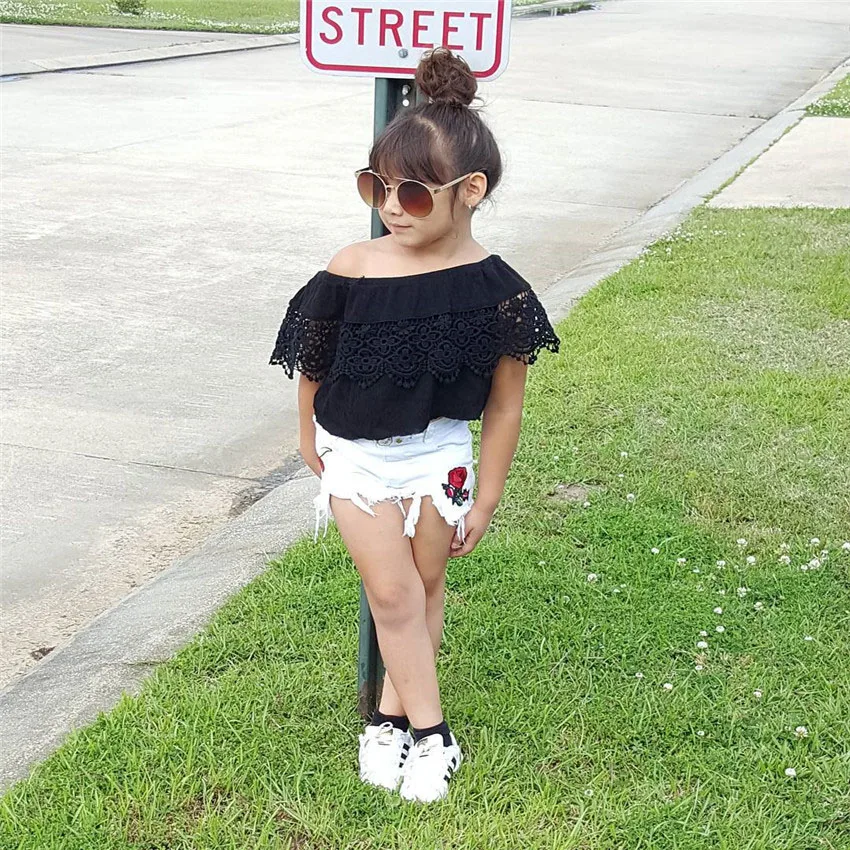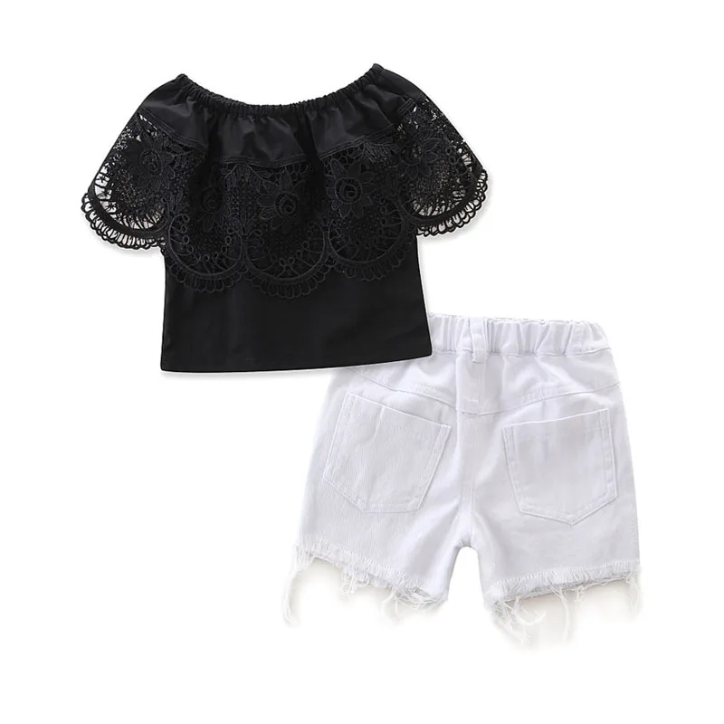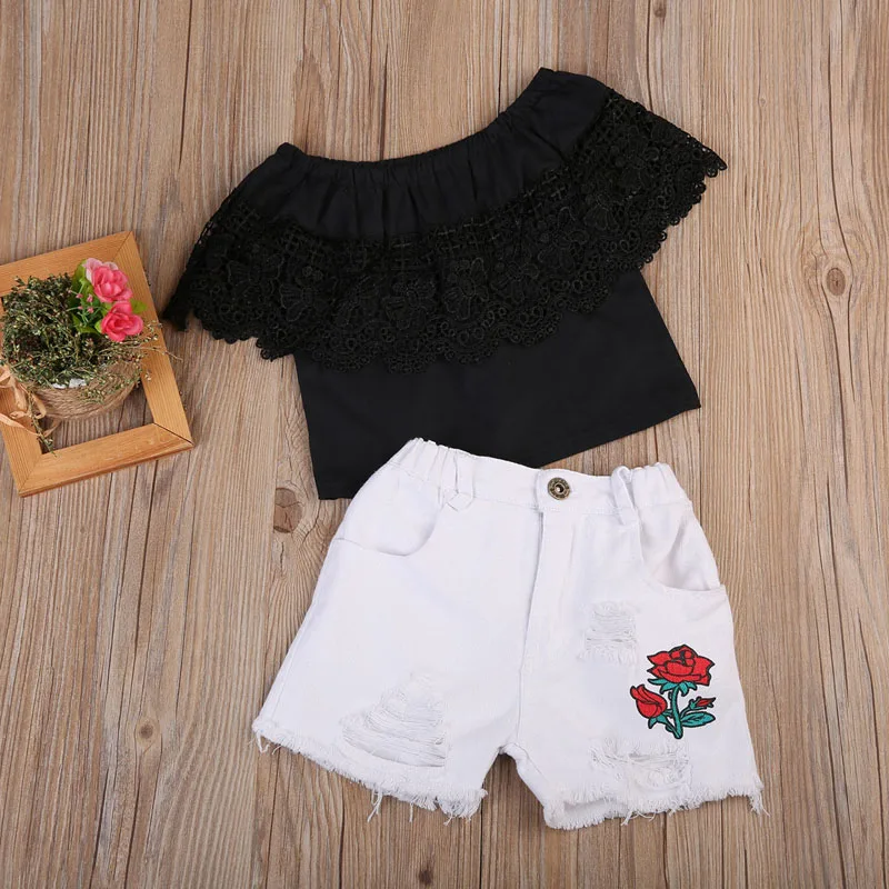 Комплект из 2 предметов для девочек: кружевной топ с открытыми плечами + рваные джинсовые шорты!