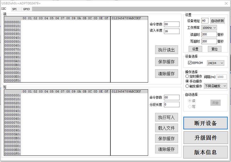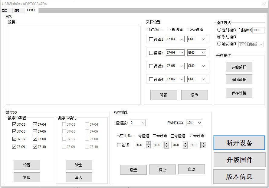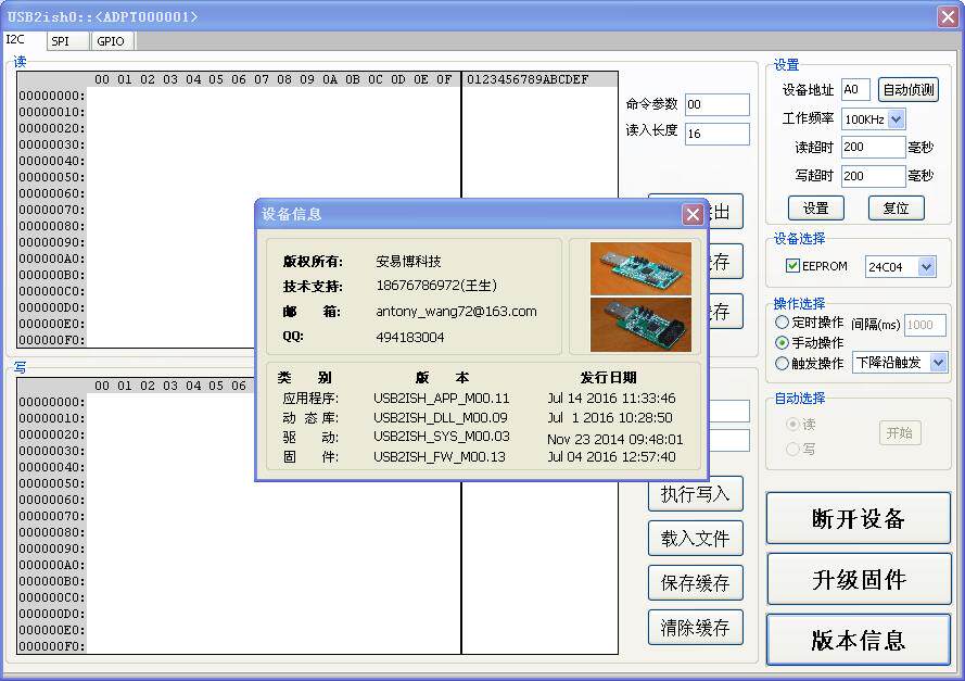 [Введение] Плата адаптера USB2UIS-это практичная и удобная Многофункциональная плата преобразования, Она интегрирует USB в UART, USB в I2C, USB в SPI интерфейс, USB в ADC, USB в PWM, интерфейс USB-GPIO. Программное обеспечение ПК удобно связывается с устройствами с UART, I2C, SPI и т. д., с контролируемым ADC выборкой, PWM и GPIO выходами. Особенности системы: 1> Дополнительное 3,3 В и 5 В Выходное напряжение. 2> Самовосстанавливающиеся предохранители для предотвращения перегрузки по току. 3> скорость передачи данных USB2.0. 4> с демонстрационным программным обеспечением для справки добавьте специальное тестовое приложение скандинавских стран RF2401. 5> Три режима чтения и записи (руководство, таймер и прерывание). 6> предоставить DLL интерфейс для стороннего развития. 7> Поддержка USB в UART порт приложения под Linux 8> Прошивка может быть обновлена через usb-кабель компьютера, и программное обеспечение может быть обновлено, чтобы решить проблемы технического обслуживания. Для специальных применений, его также можно настроить. 9> добавлен справочный код VB, VC, labview, QT, c + + builder. 10> добавлен новый SPI Slave приемник. 11> новый драйвер содержит цифровые подписи и поддерживает системы XP, win7, win8, win10 (32, 64 бит) и linux. 12> Один серийный номер устройства, который поддерживает одновременный доступ к нескольким устройствам. 13> добавлен самотест SPI и автоматический поиск адреса устройства I2c. 14> Добавлено 25 серий SPI flash чтение и запись. 15> добавлена Загрузка файлов шестигранного формата и смешанного редактирования и отображения шестигранных и текстовых режимов. Особенности интерфейса: 1> UART скорость передачи данных до 230400 2> скорость передачи данных I2C может быть настроена до 800 k, поддержка чтения и записи с помощью прерывания 3> скорость передачи данных SPI может быть установлена до 12 м максимум, поддержка чтения/записи с прерыванием и контролем расширенного CE, четыре режима настройки (фаза и полярность), и поддержка получения в качестве раба 4> 10 бит ADC Точность выборки и 200 K частота выборки, четыре канала могут быть настроены для одиночных и дифференциальных входов 5> 8 цифровых входов и выходов ввода/вывода, один выход ввода-вывода расширения и один вход ввода-вывода прерывания 6> четырехканальный ШИМ Частотный выход, частота до 100 K рабочий цикл регулируется. Использование: Отладка оборудования, тестирование производства. Управление беспроводным модулем, управление светодиодами и т. д. 【Outline】