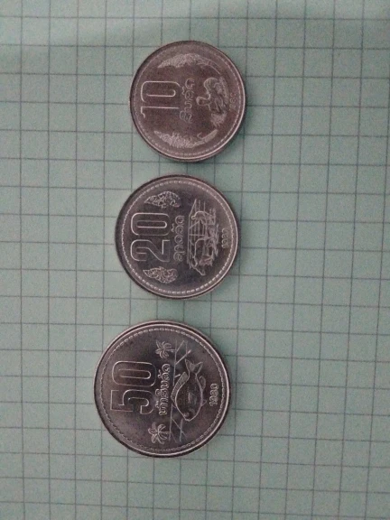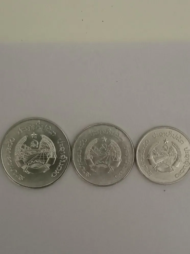 Монеты из белого металла. На аверсе большой монетке рыба, надписи, цифра 50 и рыба,год выпуска 1980; средняя - 20, 1980 года выпуска и человек пахающий поле на буйволе; маленькая- 10, мужик с охапкой какой то травы- растения ( рис наверное). На реверсе у всех герб - серп и молот,завод,деревья,часть шестерни и ТД. Размеры,как всегда с заляпонностью: 50- 25 мм, 2.25 грамма; 20 - 22 мм, 1.61 грамма; 10 - 20 мм, 1.21 грамма. Монеты, если и были в обращении, то недолго, блестящие, присутствуют заляпанности. Ребро у монеток ребристое.