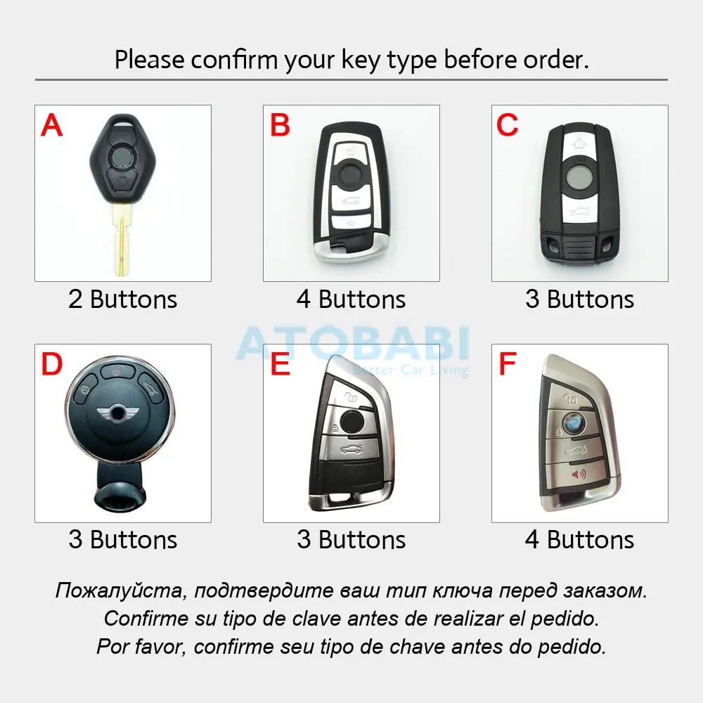Особенности и технические характеристики: 1. Бренд: ATOBABI 2. Материал: верхний слой из натуральной кожи. 3. Кнопки: как на картинке 4. Отличное соответствие размеру ключа и точному положению кнопки. 5. Защитите ваши автомобильные ключи от повреждений, следов, пыли и царапин. 6. Не влияет на сигнал автомобильного ключа. Совместимость с моделями: Для BMW E90 F30 1 3 5 серии X1 X3 X5 X6 Z4 Mini Cooper (Примечание: Совместимость только для справки, пожалуйста, сравните изображение с ключом автомобиля перед покупкой.) Посылка включает в себя: Чехол для автомобильного ключа-1 шт. 1 x кольцо для ключей (Автомобильный ключ в комплект не входит.)