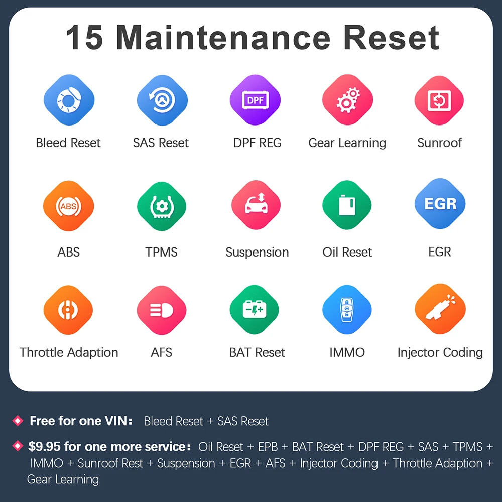 1. Служба сброса масляной лампы: Позволяет выполнить сброс для нового подсчета срока службы моторного масла после изменения масла. 2.EPB сервис: Это важно для поддержания безопасности и эффективности электронной тормозной системы. 3. Обслуживание батареи летучей мыши: Позволяет инструменту сканирования оценить состояние заряда батареи, контролировать ток замыкания, зарегистрировать замену батареи и активировать состояние остальной части транспортного средства. 4. Служба DPF: Специально работает для дизельной системы Сажевых фильтров с регенерацией DPF, замена компонентов DPF teach-in и DPF teach-in после замены блока управления двигателем. 5. Обслуживание SAS: Помогает очистить память датчика угла поворота руля и играет важную роль в калибровке датчика угла поворота руля. 6. Услуги TPMS: Имеет значение в отображении идентификационных кодов датчиков от ЭБУ транспортного средства, вводе идентификационных кодов замены датчика TPMS и тестовых датчиков. 7. Программирование ключей IMMO: Уникальное Программирование автомобильных ключей и функция считывания ПИН-кода, он в основном используется для отключения ключей от утерянного автомобиля и программирует Новый Сменный брелок для ключей. 8.ABS кровотечение: ABS тормозное кровотечение для получения твердой тормозной колодки после изнеможения воздуха после ремонта ABS насосной системы 9. Сброс люка: Память люка обычно должна быть сброшена, когда батарея автомобиля заменена или автомобиль погибает 10. Сброс подвески: Попробуйте сбросить электронную подвесную воздушную езду с массажной системой закройте все двери koeo переверните через систему measage перейдите в сброс подвески или выключите 11. Коробка передач сброс Процедура сброса передачи Адаптивное обучение DIY. Начните машину и ведите машину. После выполнения этой процедуры блок управления двигателем (ECU) и блок управления коробкой передач (TCU) будут работать вместе, чтобы узнать, как Вы управляете, отслеживая вашу модель вождения. После того, как вы выполните этот метод программирования TCU / ECU диск автомобиля. 12. Сброс фар AFS «AFS» означает адаптивную систему переднего освещения (ночью с биксеноновыми фарами), которая вращается с любой стороны, нажимая на эту кнопку, означает, что они остаются направленными прямо вперед и не поворачиваются при повороте рулевого колеса 13. Кодирование инжектора Протекающие инжекторы и некоторые мертвые инжекторы могут быть пропущены, даже если инжектор отключен. Другие проблемы с системой зажигания и механическими компонентами также могут не показать потерю оборотов при выключенном инжекторе 14. Адаптация дроссельной заслонки Корпус дроссельной заслонки представляет собой трубу с поворотным плоским клапаном (бабочкой), который используется для контроля количества воздуха, входящего в двигатель. В автомобиле с электронным впрыском топлива Датчик положения дроссельной заслонки и датчик воздушного потока связываются с компьютером, который поставляет необходимое количество топлива на инжекторах. Необходимо переосваивать Положение датчика дроссельной заслонки после очистки или ремонта 15. Обучение снаряжению: Инструмент сканирования отслеживает сигналы некоторых датчиков положения распределительного вала, чтобы определить, выполнены ли все условия, чтобы продолжить процесс работы двигателя