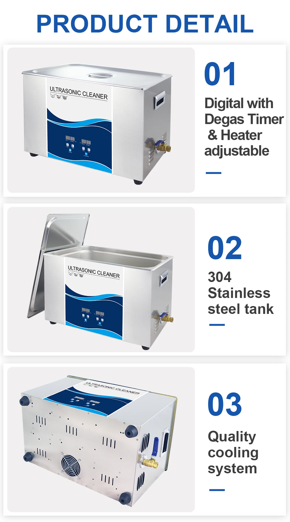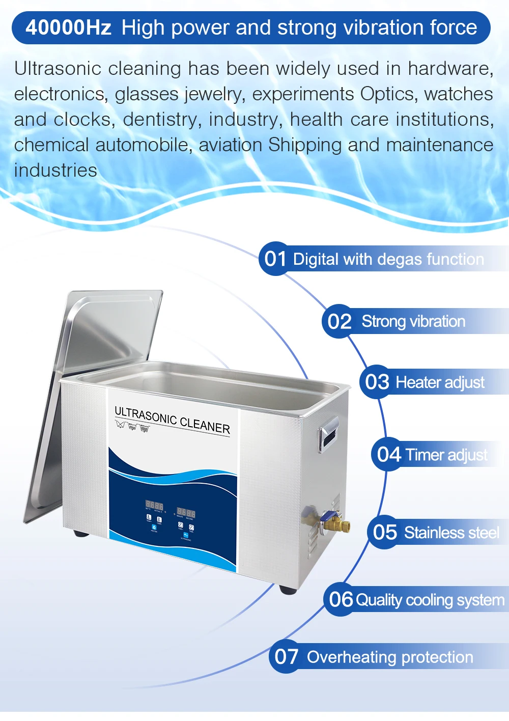 Прочная конструкция из нержавеющей стали. Ультразвуковая очистка и нагрев могут работать одновременно. Высокоэффективная очистка от мелких пятен. Большой цифровой таймер и отображение температурыДля точного контроля времени стирки и температуры. CE, FCC и RoHS одобрены. Встроенный мощный преобразовательМожет повысить ультразвуковую мощность и сделать превосходный результат очистки Корзина для очистки из нержавеющей стали для очистки некоторых мелких предметов, которые требуют меньшего трения, это может уменьшить трение между маленькими предметами и баком. Плотно прилегающая крышка из нержавеющей стали с ручкой для предотвращения рассеивания тепла воды. Слив с клапаном регулирования потока для легкой очистки и полоскания Нескользящие резиновые ножки. Используйте водопроводную воду только для общей очистки, вы также можете добавить около 5-10 мл моющего средства в воду, чтобы улучшить результат стирки, когда это необходимо.Применение