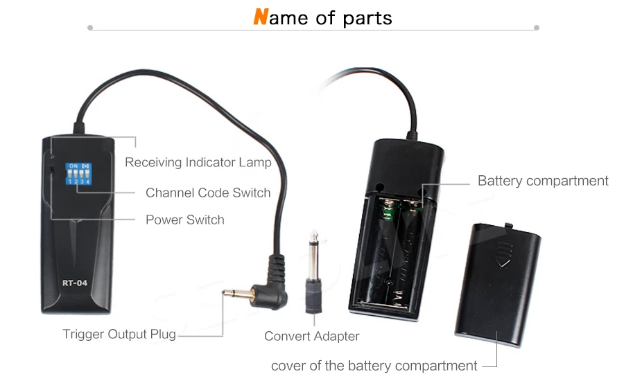 Беспроводной триггер вспышки;16 каналов на выборПотребляемая мощность передатчика: 23A 12В батарея (входит в комплект)Вход питания приемника: 2 батарейки AAAДлительный срок службы триггерной батареи, один год или более 20 000 непрерывно триггеровРазмер вилки приемника: 3,5 ммРазмер адаптера для штепсельной вилки приемника: 3,5 мм --> 6,35 ммКабель для синхронизации ПК в комплектеРабочая частота радио: 433 МГцКак использовать: