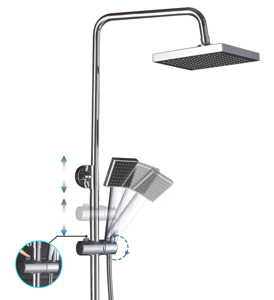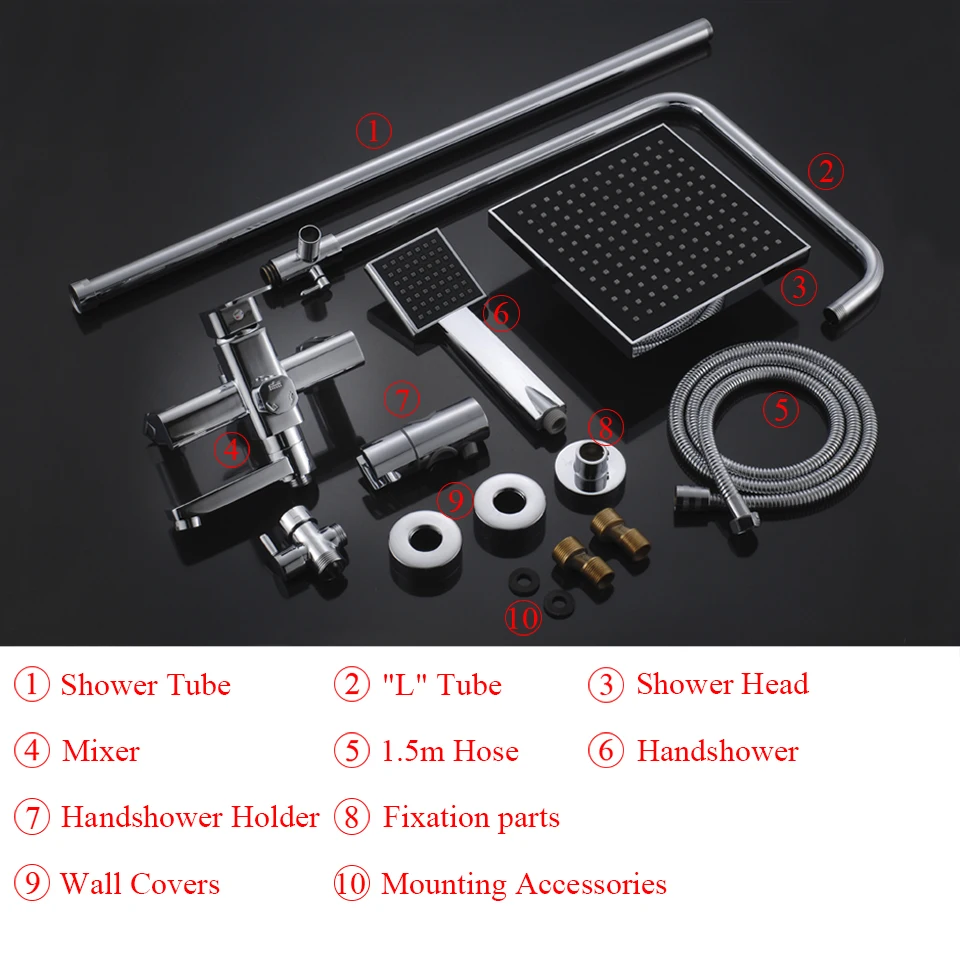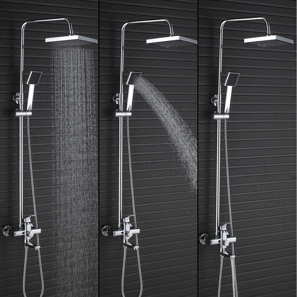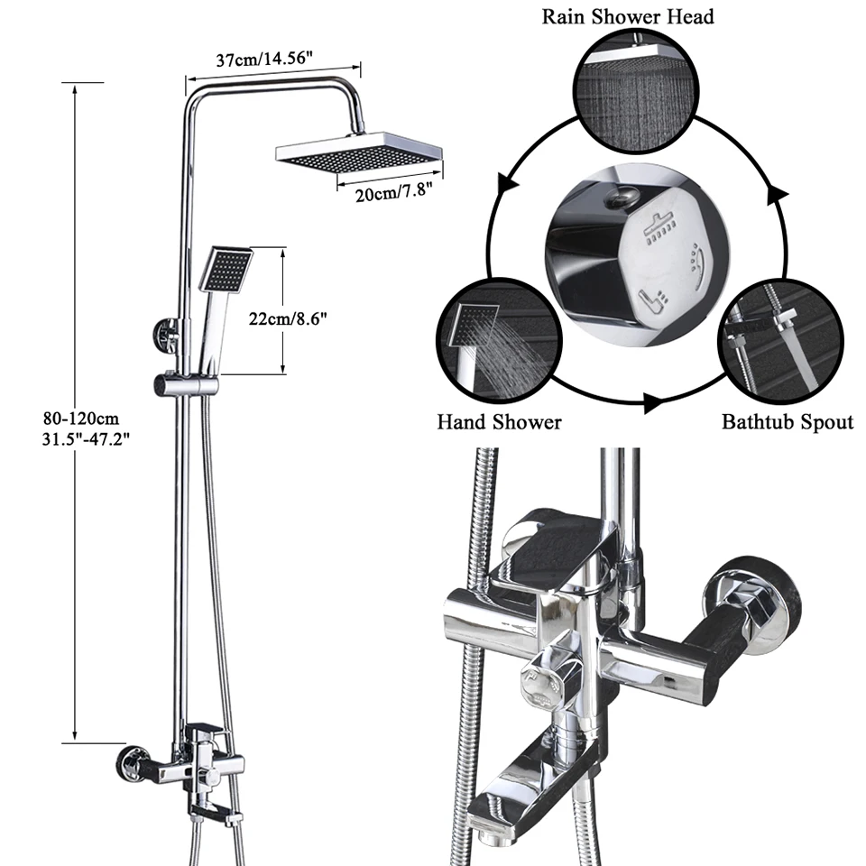 Дизайн: современный Финишная обработка: хром Насадка для душа: смеситель для душа Материал насадки для душа: АБС-пластик Материал ручного душа: АБС-пластик Размер лейки: 8 дюймов (20 см) Общая высота крана (см): 80-120 см (31,5-47 дюймов), пожалуйста, свяжитесь с нами, если вам нужен более высокий стиль. Расстояние от центра до центра 13,5-17 см (5,3 "-6,6") может регулироваться Установочные отверстия: три отверстия Количество рукояток: одна рукоятка Тип клапана: керамический клапан Материал корпуса смесителя: латунь Материал гусака: латунь