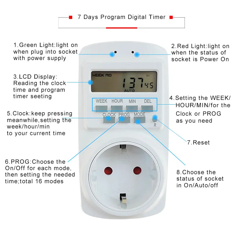 Параметры: Еженедельный цифровой таймер 1. Аккумуляторная Ni-MH батарея 2. Мин. время установки: 1 мин 3. Макс. Время установки: 7 дней 4. Номинальное напряжение: 90-250 В 5. Номинальный ток: 16 А (макс.) 6. Частота переменного тока: 50-60 Гц 7. Вес: 0,15 кг 8. Материал: Огнестойкий Поликарбонат 9. Внутренний материал: чистая медь 10. Программа в день: 16 групп ВКЛ/ВЫКЛ Посылка включает в себя: 1 * картонная коробка 1 * цифровой таймер 1 * Руководство пользователя