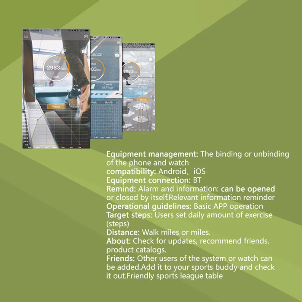* Дополнительные функции: подсчет шагов, сжигание калорий, пройденное расстояние, спортивное управление, секундомер, будильник, удаленная фотография, календарь, облачный сервис, анализ данных, управление мишенями,