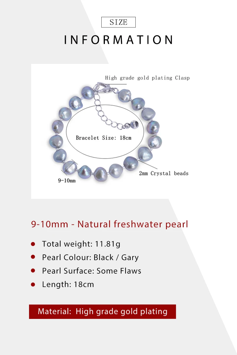 Информация о продукте Бренд: ASHIQI Тип камня:Натуральный пресноводный жемчуг Общий вес: 17,81 г Форма жемчуга: барокко Цвет жемчуга: черный/серый Жемчужный Блеск: очень хорошо Жемчужная Поверхность:Некоторые недостатки Размер жемчуга: 9-10 мм Материал: Высококачественное золотое покрытие Длина: 18 см Упаковка: Подарочная коробка/Сумка