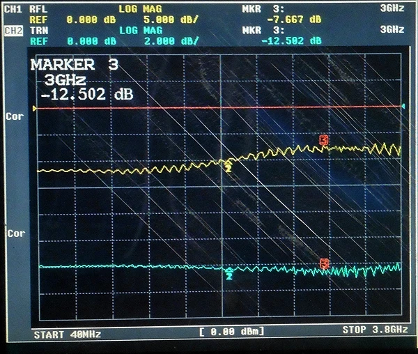 Диаграмма частотного отклика-синяя линия составляет 2 дБ/див для выделенного порта, а желтая линия-порт распределения. Потеря отражения составляет 5 дБ/див: