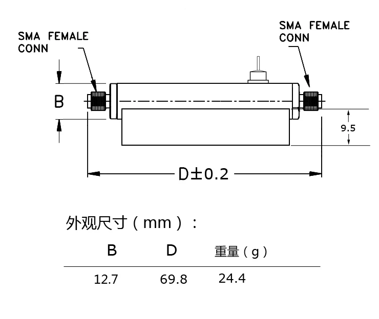 Интерфейс: SMA-F, SMA-F (входной терминал имеет красную точку), через емкость конденсатора свинца (+ 5 В постоянного тока). Внешний размер: