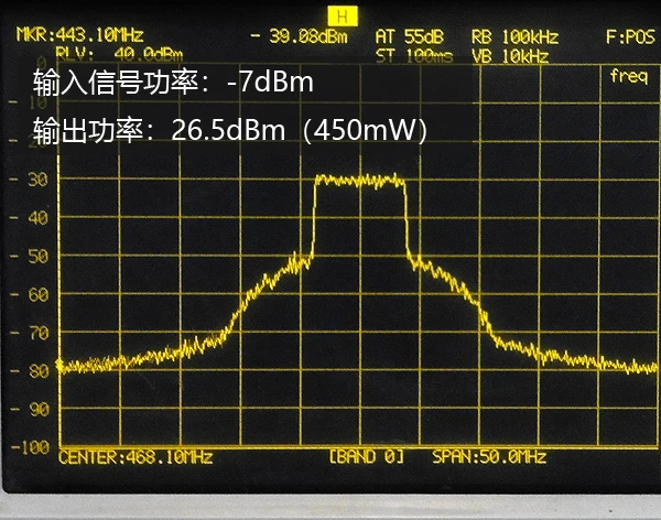 Напряжение источника питания: + 5 В постоянного токаРабочий ток: 300 ~ 350 мА (статический)450 ~ 550ма (COFDM выход)500 ~ 600мА (насыщенный выход) Максимальная входная мощность: < 10dBmP1dB мощность: > 29dBmНасыщенная Выходная мощность: > = 30 дБм (1 Вт) Выходная гармоника в два раза: > 25 dBc @ Po:1WВыходная гармоника в три раза: > 40 dBc @ Po:1W Гармонический спектр выходной мощности 1 Вт: