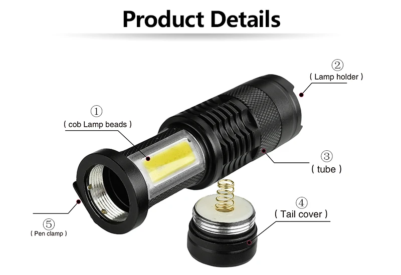 1 * Фонарик (Обратите внимание: аккумулятор не входит в комплект) Информация о продукте: ①.COB лампы; ②. Держатель лампы; ③. Трубка; ④. Задняя крышка; ⑤. Зажим для ручки