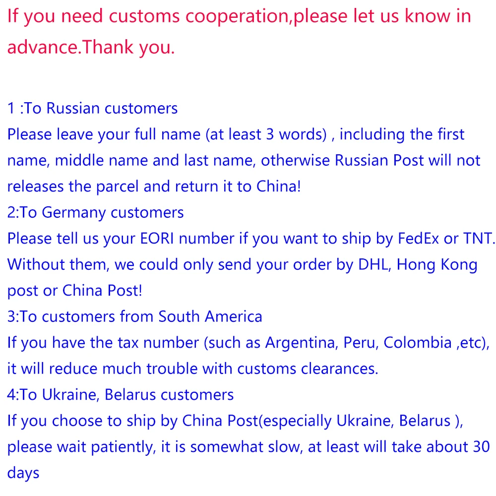 Для вашего удобства, если вы желаете получить товар в коробке, мы могли бы объявить ваш товар как «подарок/образец» на коммерческом счете или таможенной декларации, И мы стараемся изо всех сил, чтобы помочь вам свести к минимуму любые GST или НДС налоги и сборы на ввоз импортных товаров. Но мы не можем гарантировать отсутствие налоговых платежей, которые зависят от политики вашей страны. Мы принимаем оплату по системе Alipay, paypal, western union и т. д.; Полная оплата должна быть произведена в течение 19 дней после того, как разместите свой заказ, если нет, то заказ будет автоматически аннулирован окончании пробного периода. Цена не включает в себя пошлины. Мы не взимаем пошлин в странах доставки.