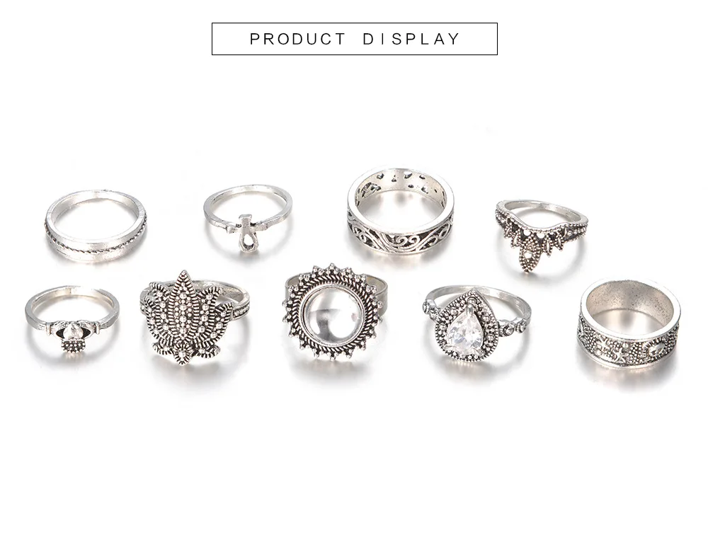 9 шт./компл. набор колец на кончик пальца античный серебряный цвет Кристалл Корона лотоса крест Солнце Тотем кольца на средний палец сердце для женщин Девушка ювелирные изделия