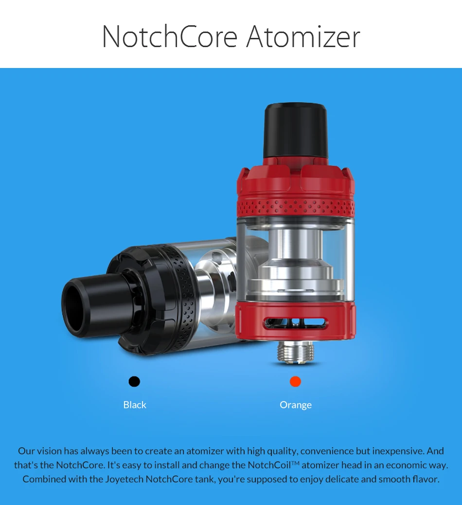 Наше видение всегда состояло в создании атомайзера с высоким качеством, удобством, но недорого. И это NotchCore. Легко установить и изменить NotchCoilТМ Распылительная головка экономичным способом. В сочетании с баком Joyetech NotchCore вы должны наслаждаться нежным и гладким вкусом.