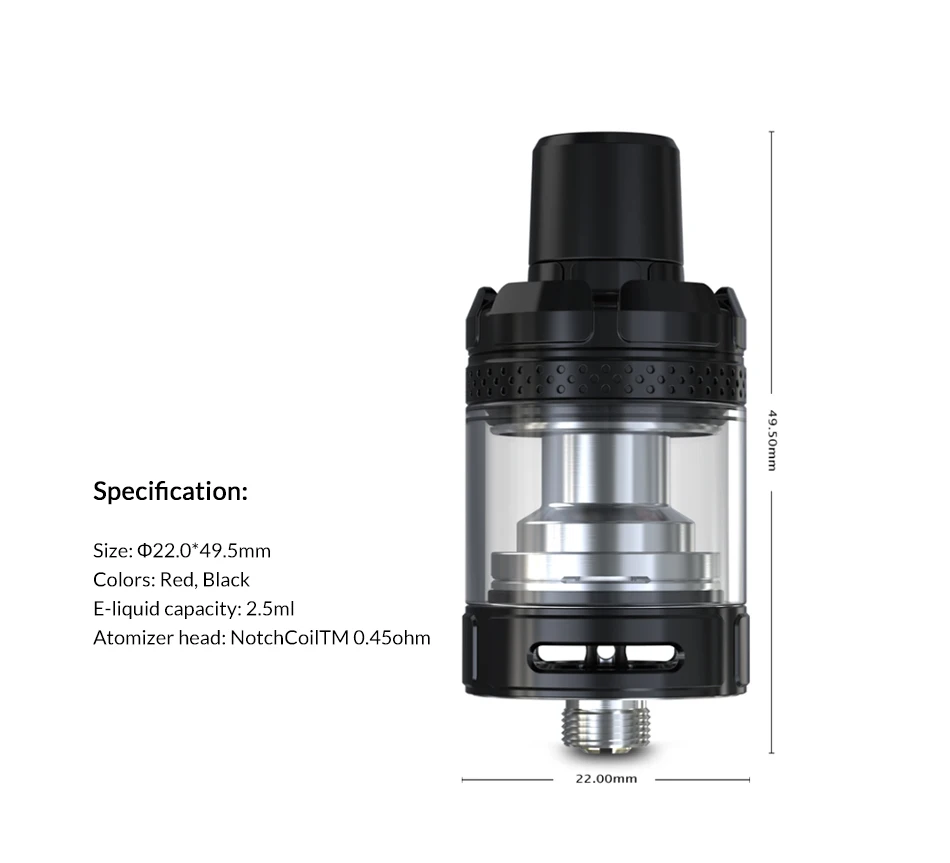 Размер: 22,0x49,5 мм Емкость: 2,5 мл Катушка: 0.45ohm NotchCoil Нить: 510