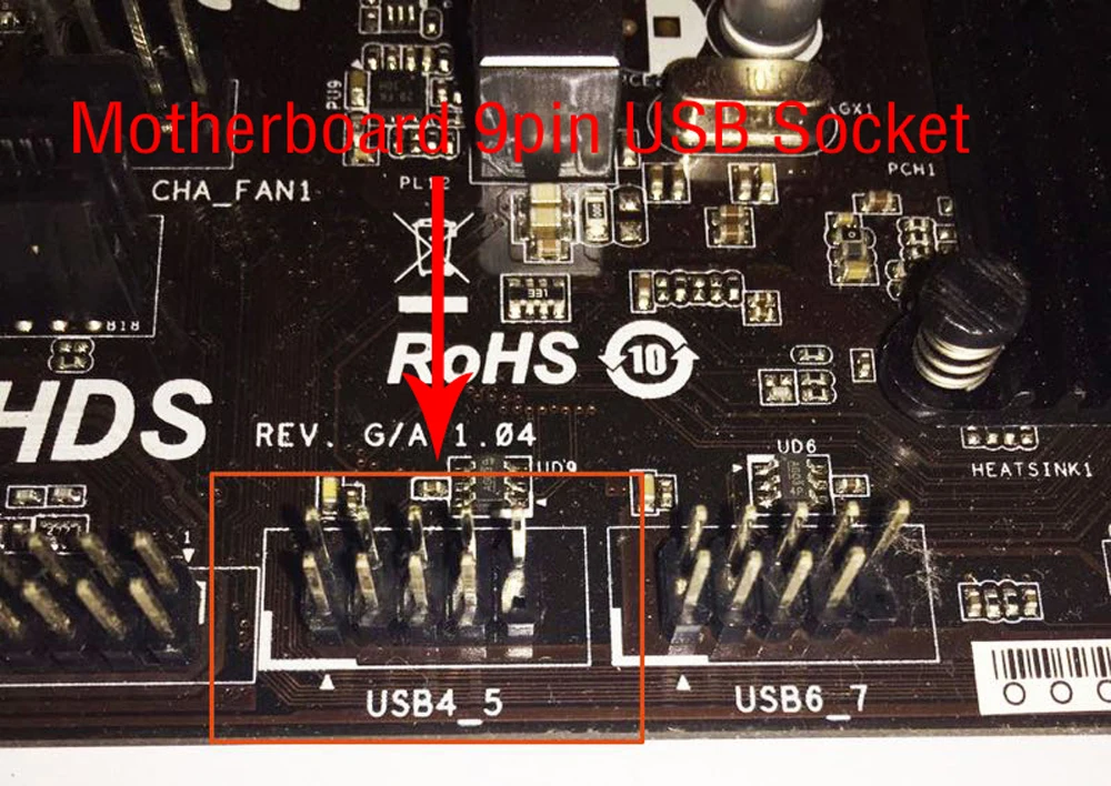 1. The watchdog hardware plugs into the motherboard's USB 9 pin socket.