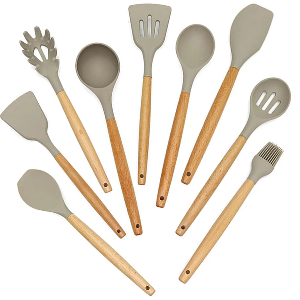 Набор включает в себя: ковш, ковш с прорезями, ковш для супа, Тернер, шлицевой ковш, гибкий ковш, шпатель, сервер спагетти, щетку, все 9 шт.