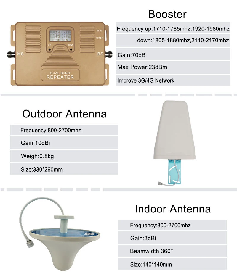 1800 МГц (группа 3) -- Uplink частота: 1710-1785 МГц/нисходящий канал частота: 1920-1980 МГц 2100 МГц (полоса 1) -частота соединения: 1805-1880 МГц/частота нисходящего канала: 2110-2170 МГц Boost: голос и 2g 3g 4g интернет. Поддержка сети: WCDMA3G + DCS 2/4G Коэффициент усиления: 70 ± 2 дБ Источник питания: AC110V ~ 220V;DC + 5V/2A Тип разъема: N-female