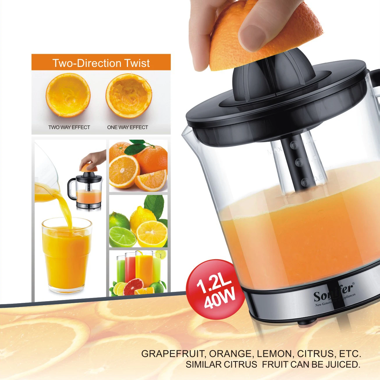 ● Ёмкость: 1.2L • Низкий уровень шума ● Прозрачный сосуд ● Двусторонний поворот ● С 1 пресс-конусом ● Съемные детали для легкой эксплуатации и очистки ● AC220-240V 50/60Hz 40W