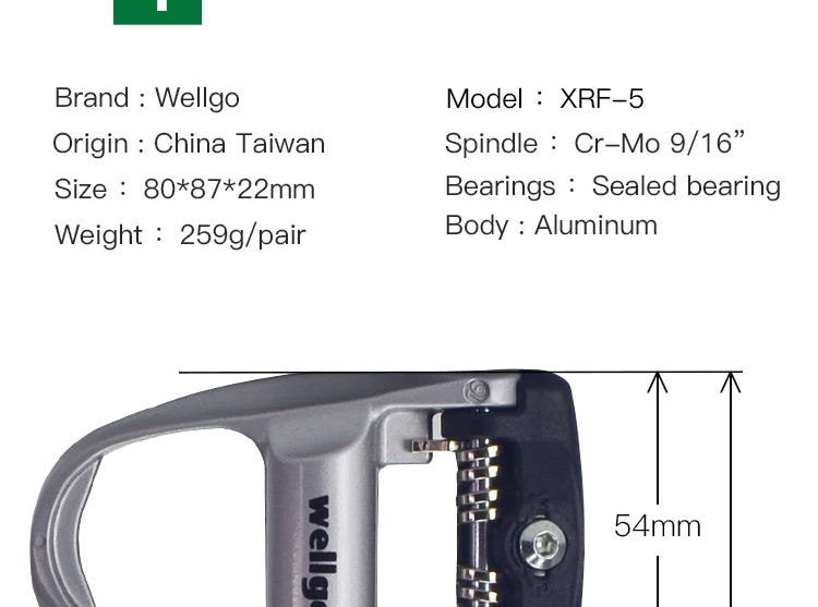 Бренд: Wellgo Модель: XRF-5 Происхождение: Китай-Тайвань Размер: 80*87*22 мм Подшипник: герметичный подшипник Вес: 259 г/пара Основной материал: Алюминий Шпиндель: CR-MO,9/16"