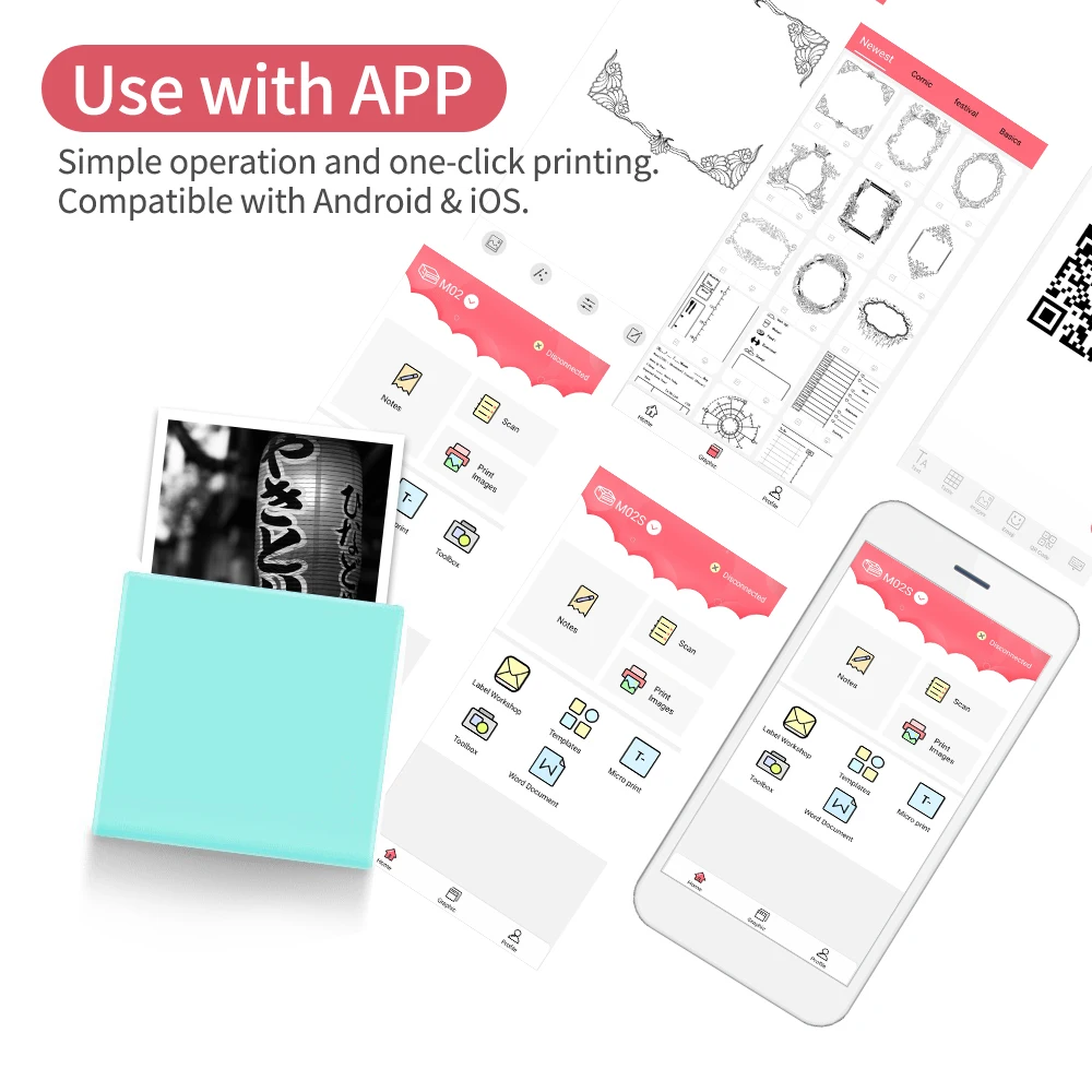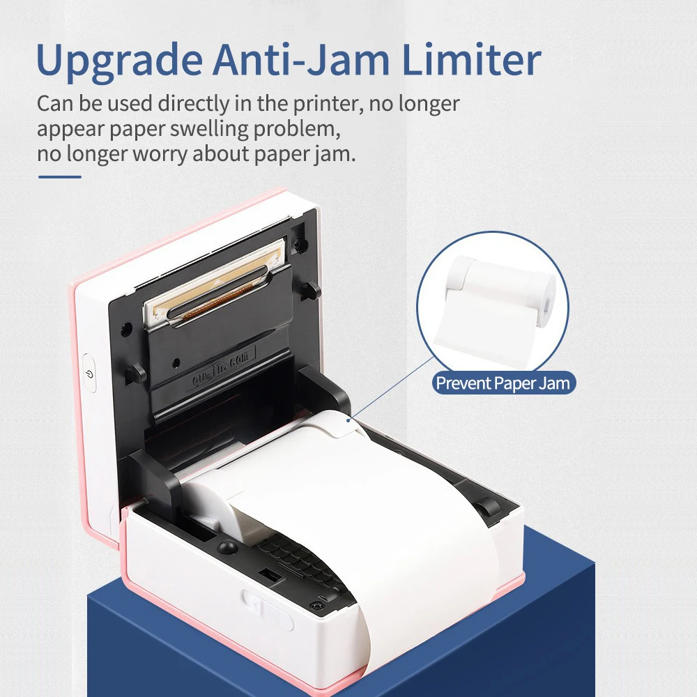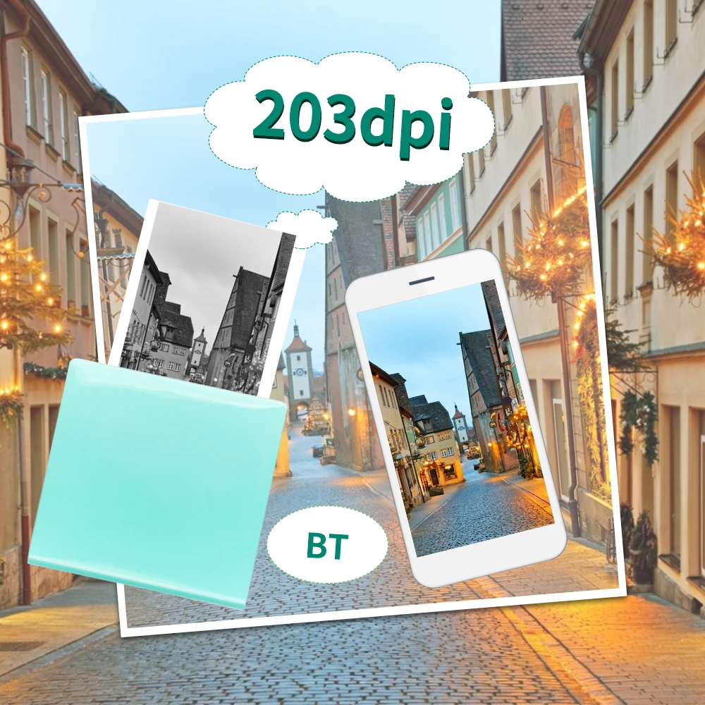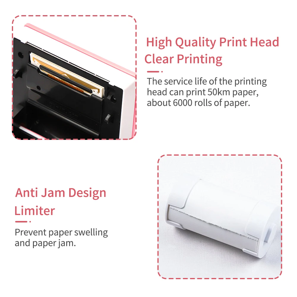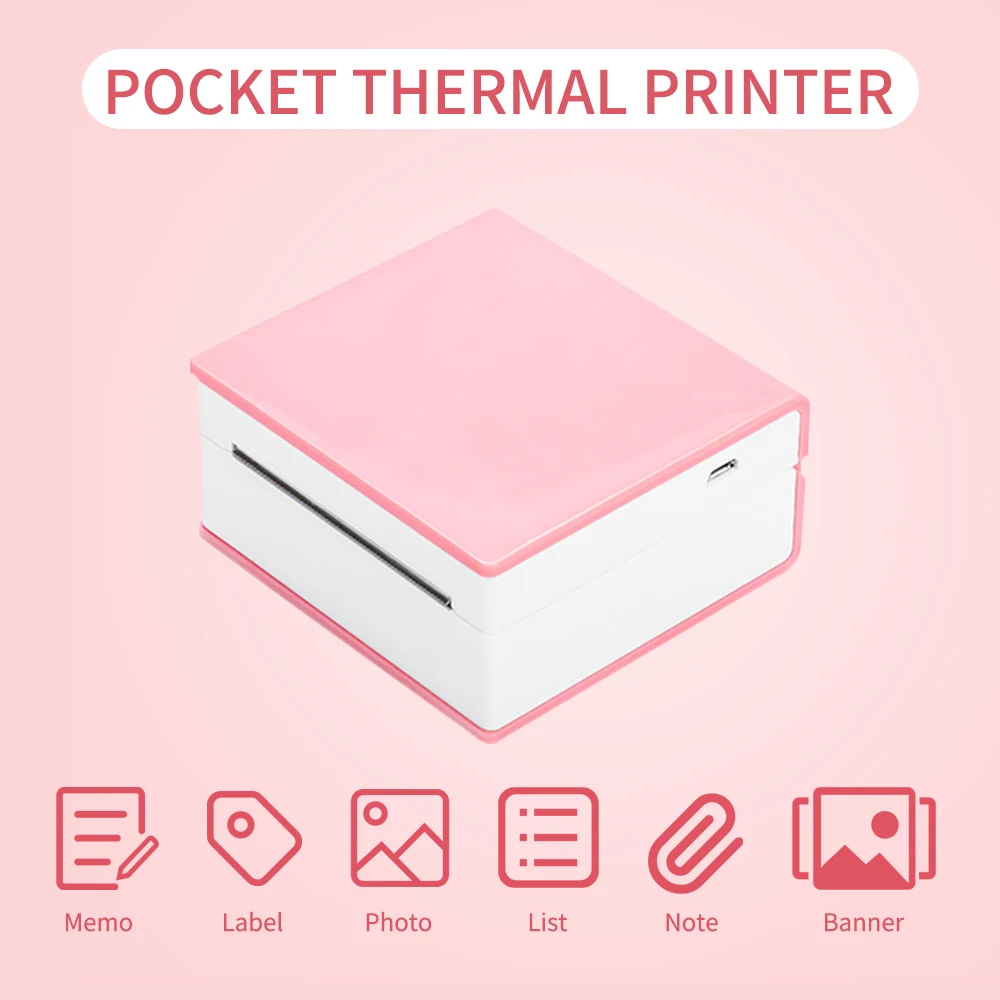 Карманный принтер:Компактный и простой, как маленькая квадратная книга, легко носить с собой. 203 точек/дюйм высокой четкости печати, 53 мм ширина бумаги, хороший и прозрачный эффект печати.