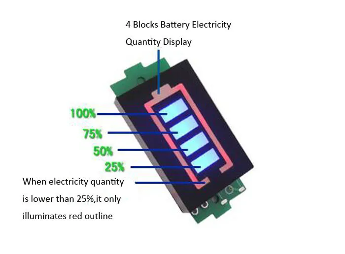 Особенности: 1. Тип батареи отображение количества электроэнергии 2. Широкие области применения: литиевая батарея 3. Использование метода: Подключите дисплейную панель с положительным и отрицательным портом с проверенным аккумулятором И отрицательный порт, цифровая трубка будет отображать количество заряда батареи в реальном времени 4. Цифровой цвет: красный контур, синий блок дисплея (когда количество заряда батареи полное, Все будет включено) Отображение параметров количества электроэнергии: 1. Когда напряжение батареи превышает N * 3,3 В, он будет освещать 1 блок количества электроэнергии (Примечание: N представляет количество батареи) 2. Когда напряжение батареи превышает N * 3,5 в, он будет освещать 2 блока количества электроэнергии 3. В тех случаях, когда напряжение батареи составляет более N * 3,7 V, он будет гореть 3 блоки количество электроэнергии 4. Когда напряжение батареи превышает N * 3,9 В, он будет освещать 4 блока количества электроэнергии 5. Когда напряжение батареи меньше, чем N * 3,3 V, дисплей 4 блоков будет выключен; Он представляет Батарея меньше, чем 3,3 V, и вы можете зарядить аккумулятор