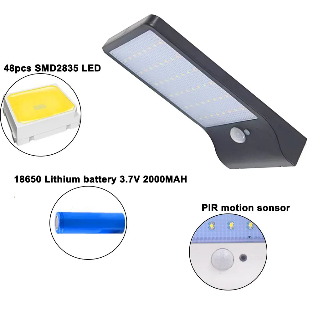 Настенный светильник на солнечной батарее, 450 лм, 48 светодиодов, с ИК-датчиком движения, 3 режима, водонепроницаемый, IP65, для маршрута, гаража, сада, безопасности, уличный светильник