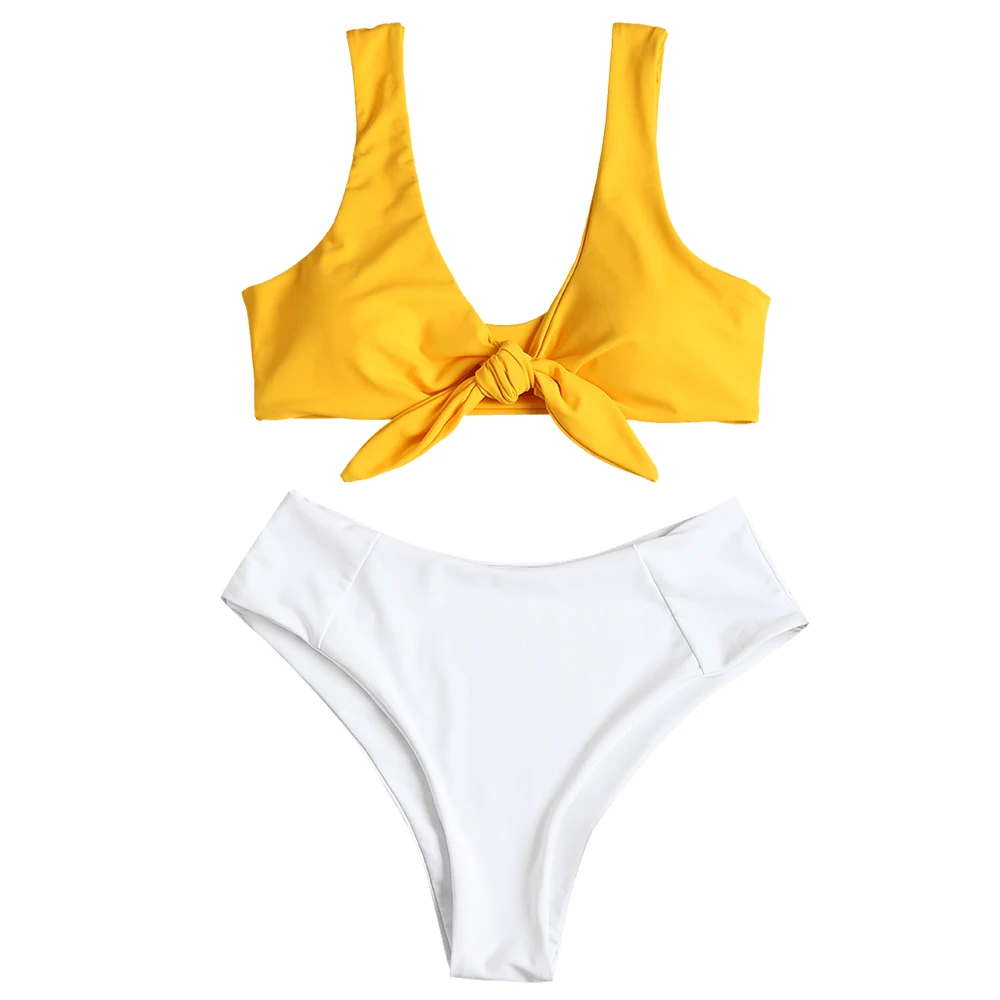 \ "ZAFUL 2018 спереди завязывается Цвет блок с высокой посадкой бикини два тона с высокой купальный костюм сексуальное глубокое круглое декольте бикини с подкладками