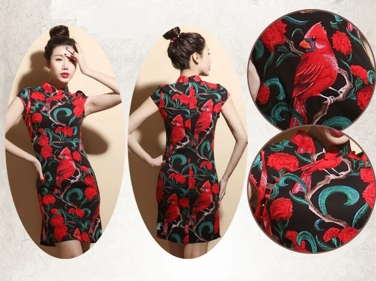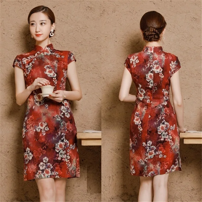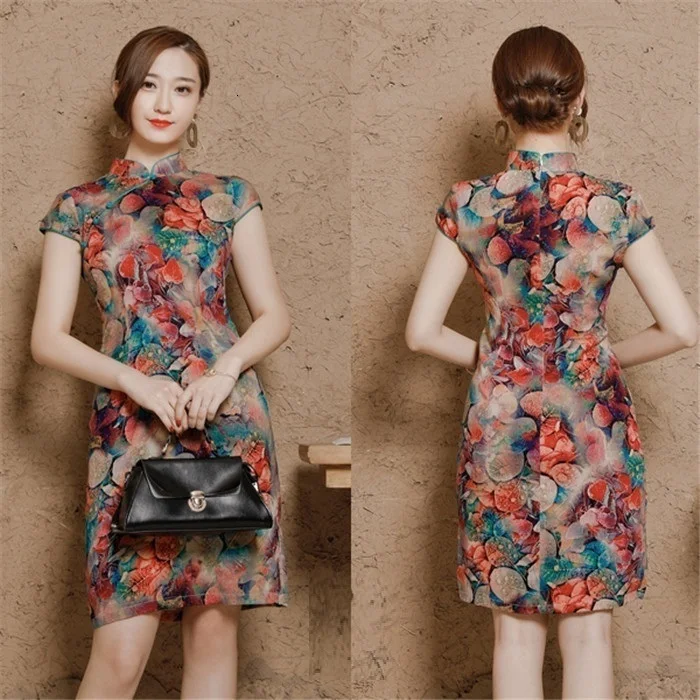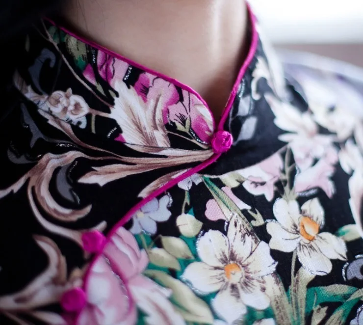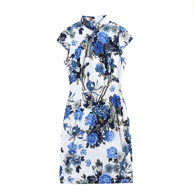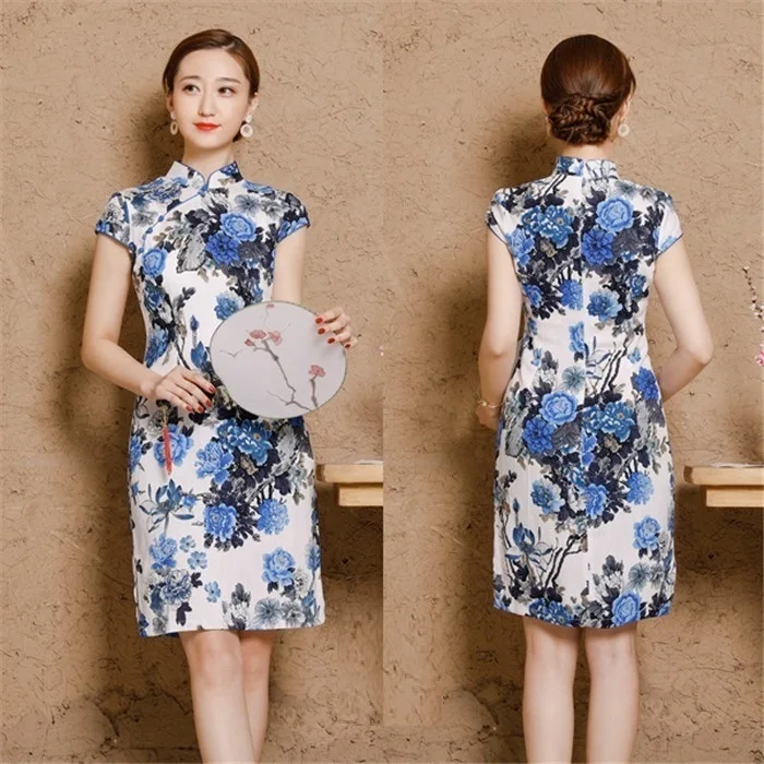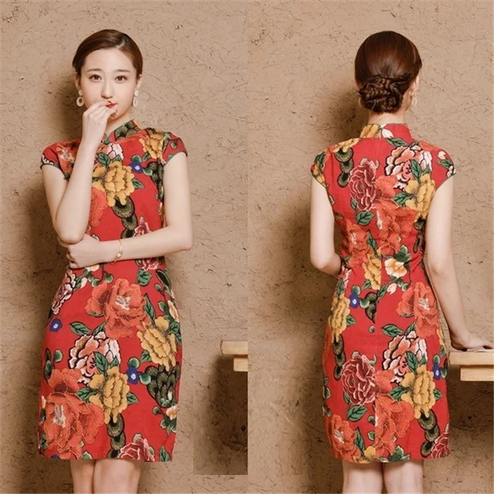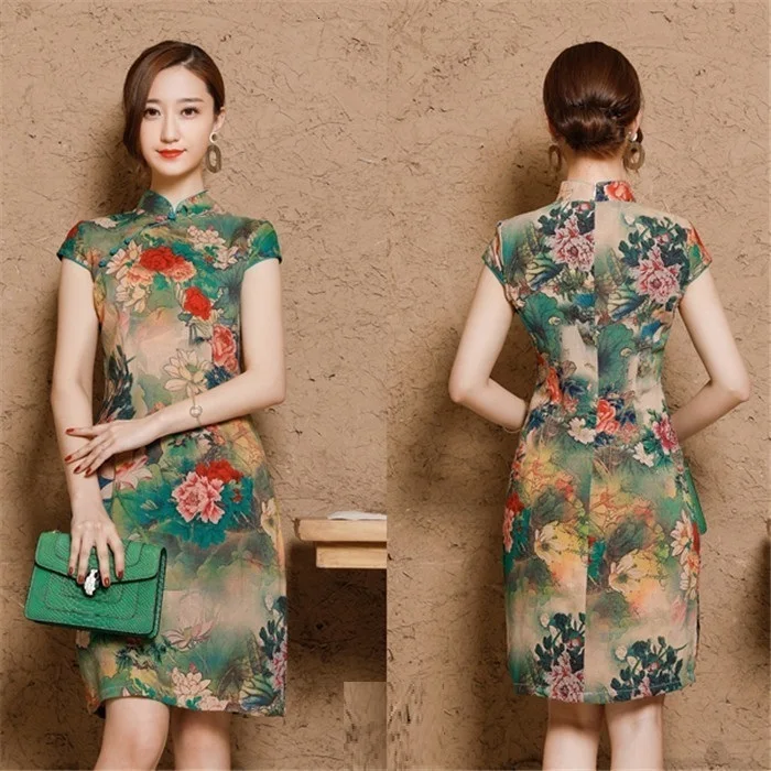 Китайские платья Qipao Cheongsam из хлопка и льна Mujer Vestidos плюс размер для женщин короткие 3XL 4XL 5XLНовое поступление летней одежды в китайском стиле с цветочным узором; Женская фиолетовая эластичная одежда в восточном стиле