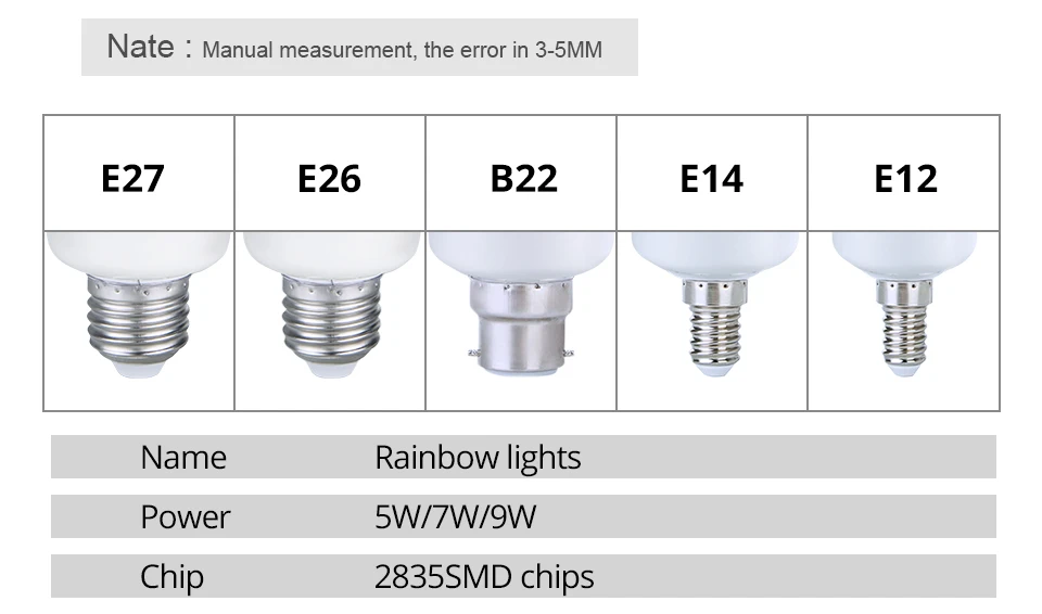 Особенности: Тип: светодиодная Радужная ЛАМПА Blub Материал: Поликарбонат Количество: 1 шт. Тип головки света: E12/E14/B22/E26/E27 Источник света: SMD 2835 Напряжение: 85-265 В переменного тока Мощность: 5 Вт/7 Вт/9 Вт Интенсивность свечения: 500 люменов Угол луча: 360 градусов 3 режима: режим прыжков/освещение/дыхание Подходит для церкви, замков, монахов, спален, гостиных, баров, отелей, ночных клубов, уличных садов, вилл, свадебных украшений, вечеринок В комплект входит: 1 x светодиодная Радужная ЛАМПА Blub